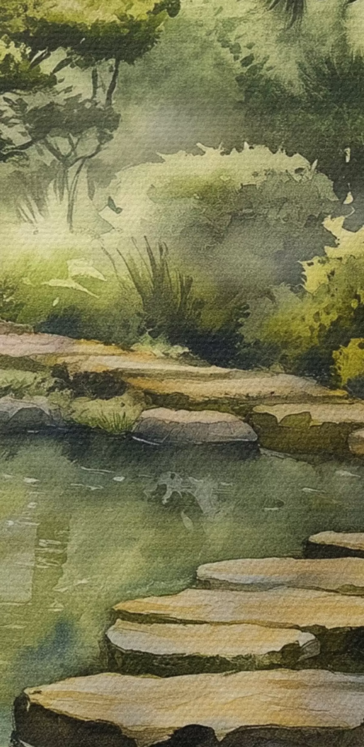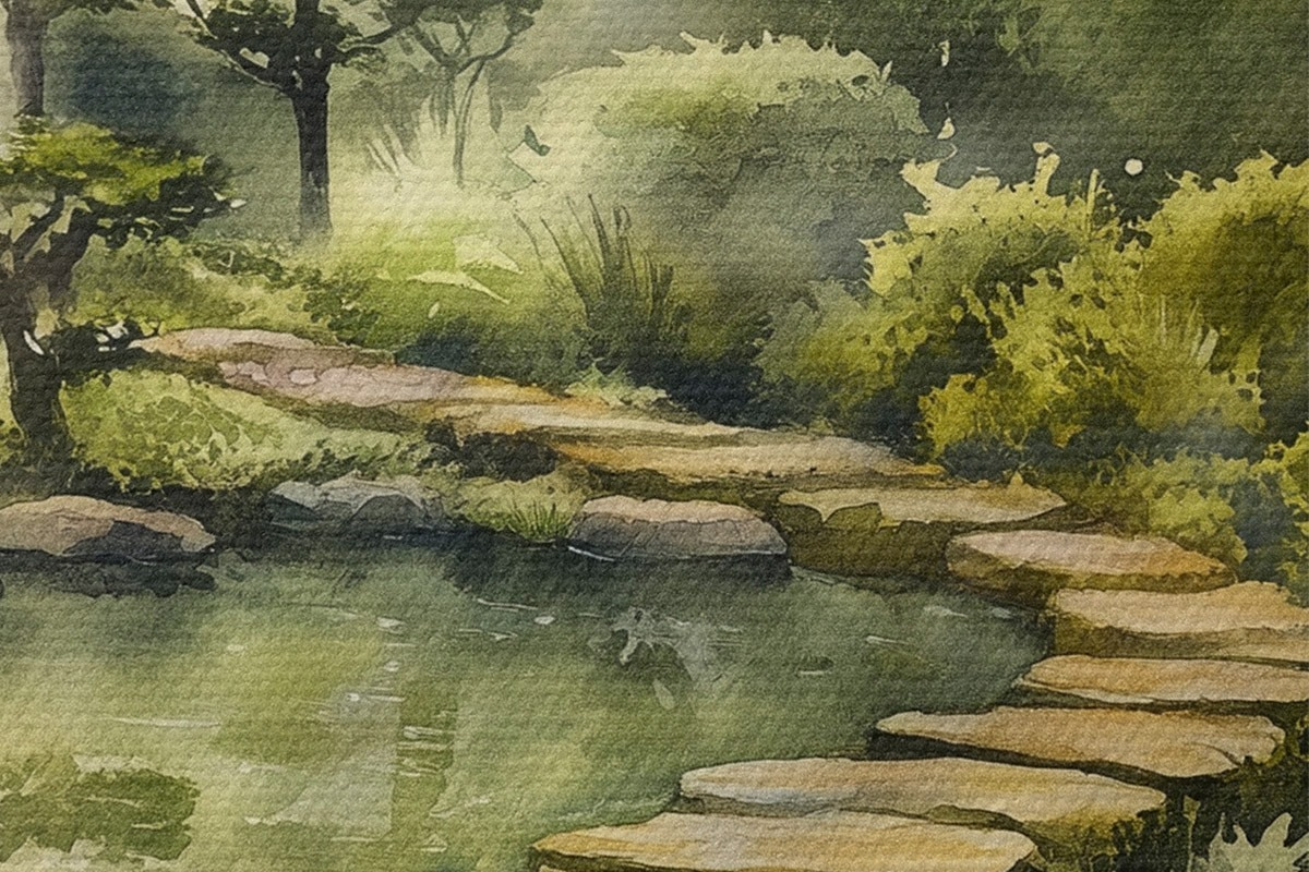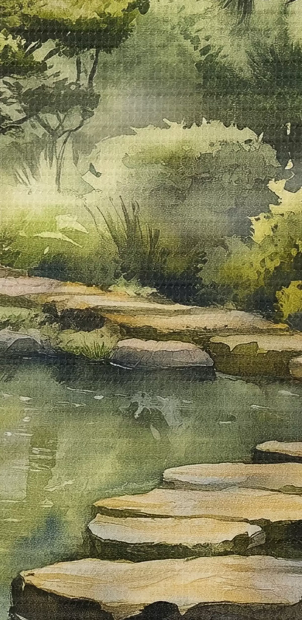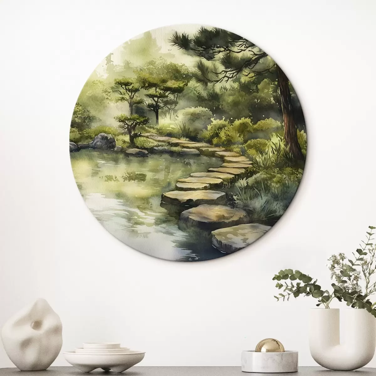 Кругла картина Східний ліс зі скелями, ставком і соснами, зелень, акварельний стиль Nr r44311