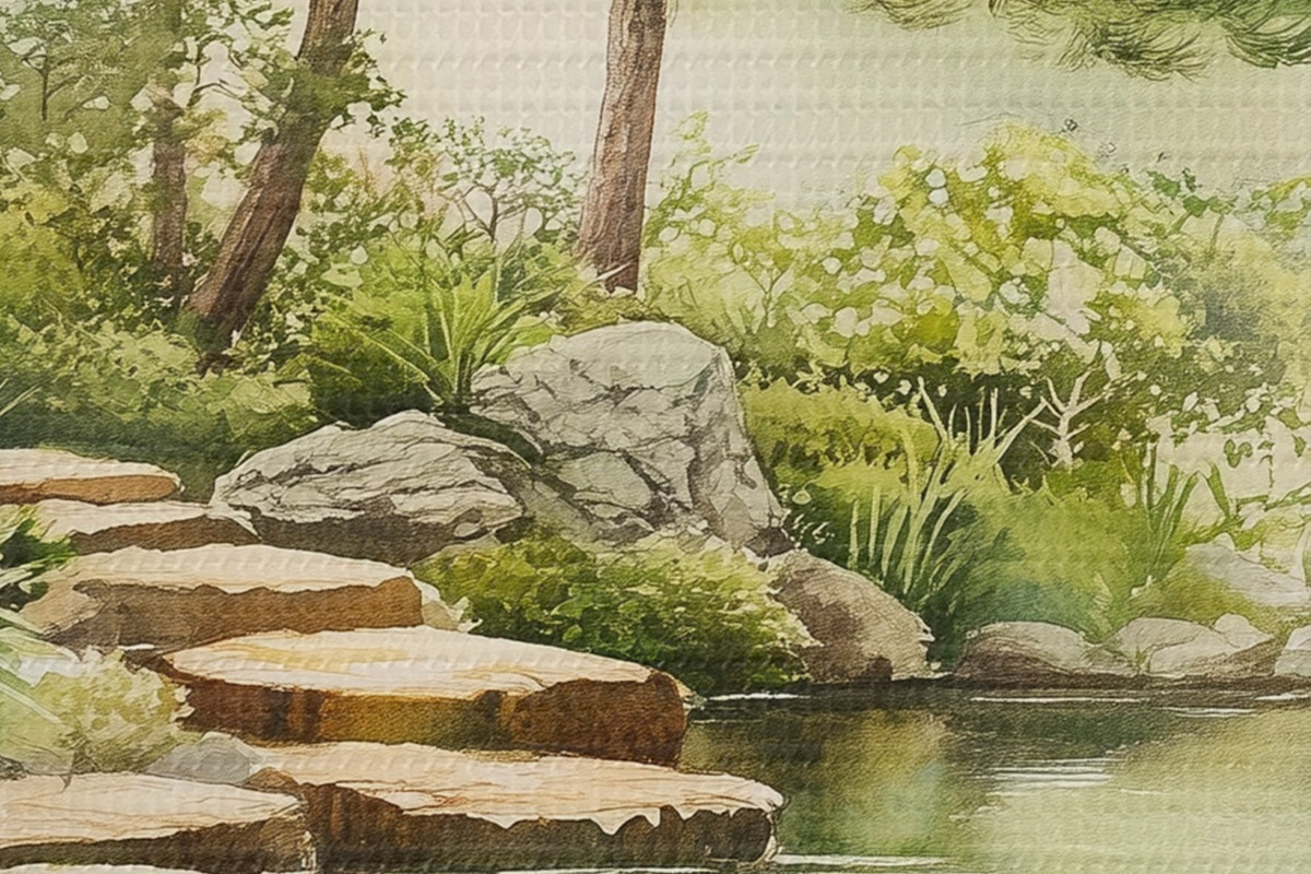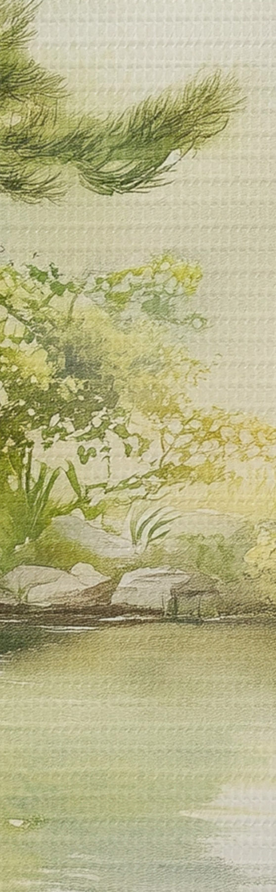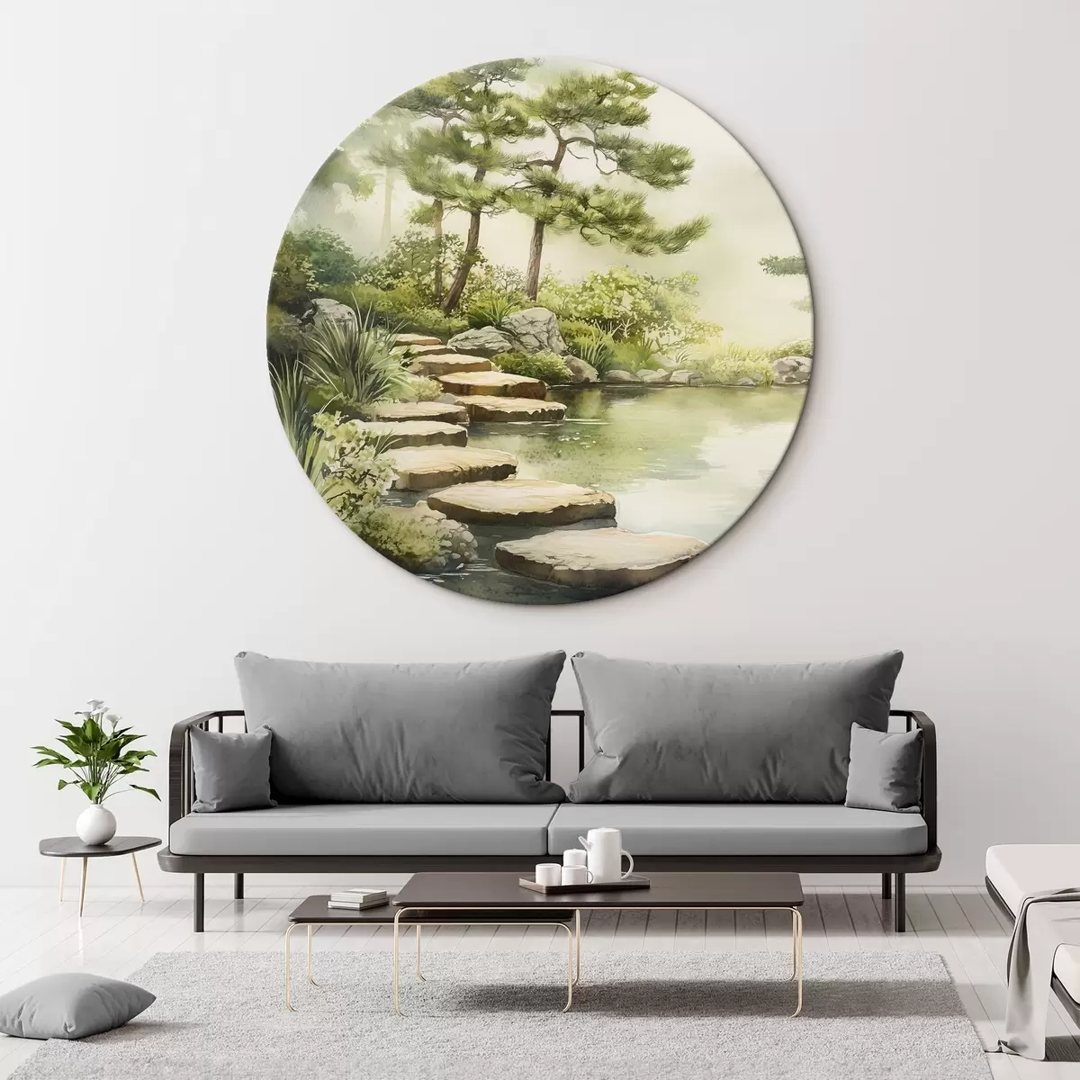 Кругла картина Східний сад з озером і деревами, природа, акварельний стиль Nr r44313
