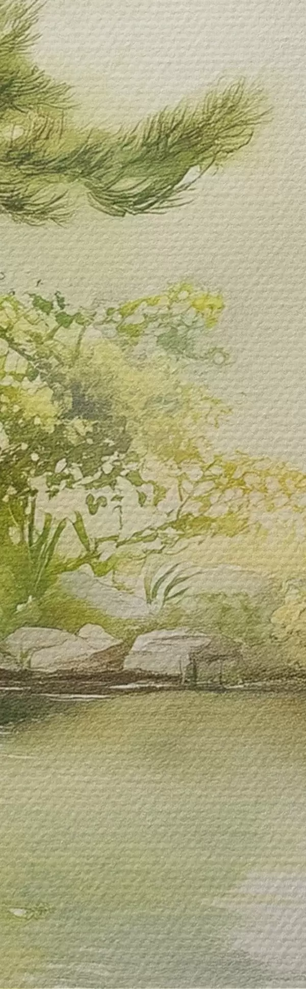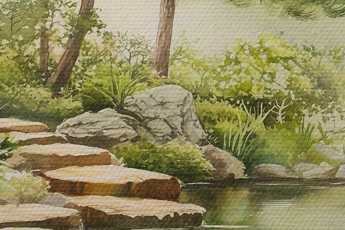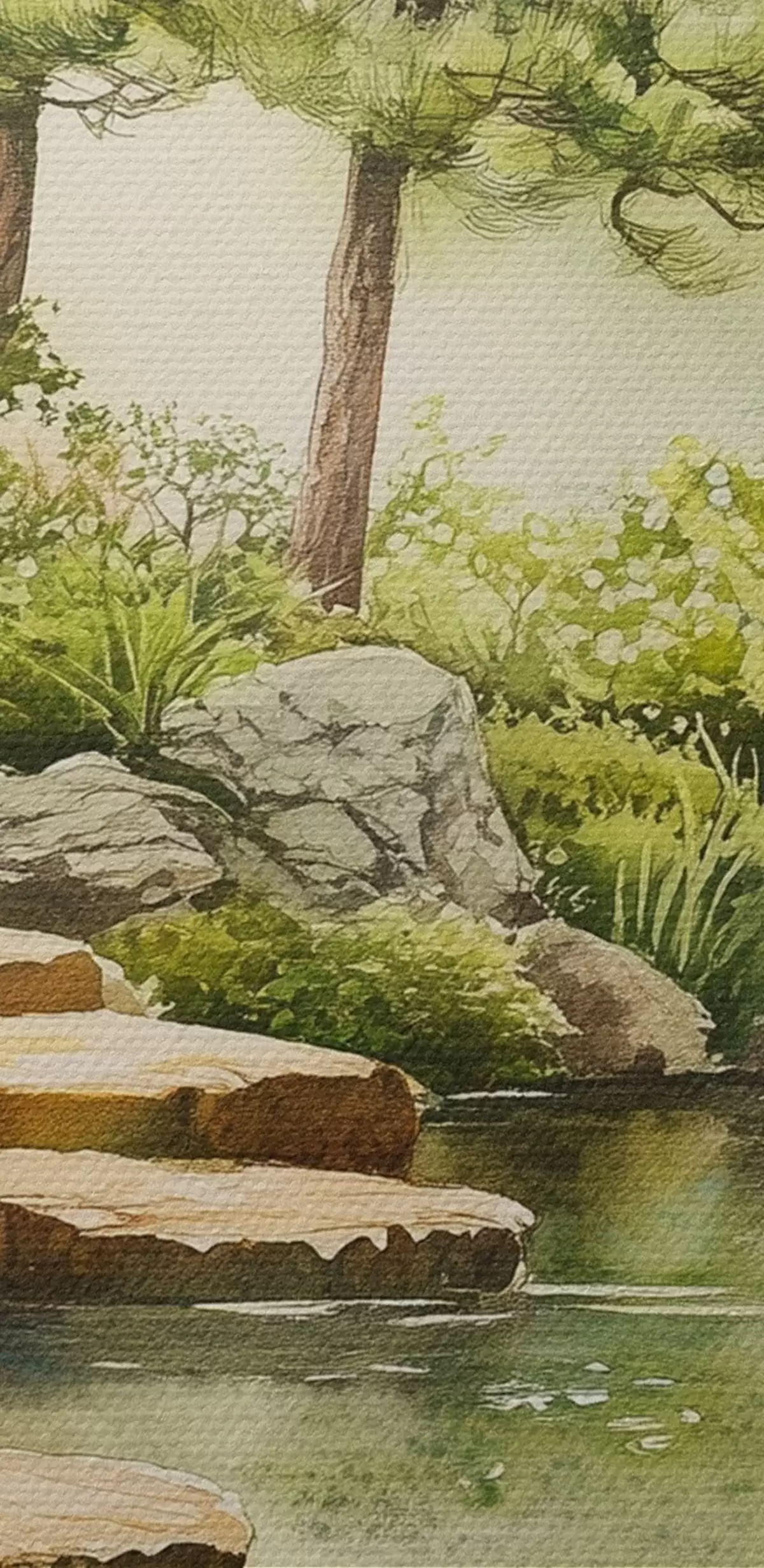 Кругла картина Східний сад з озером і деревами, природа, акварельний стиль Nr r44313