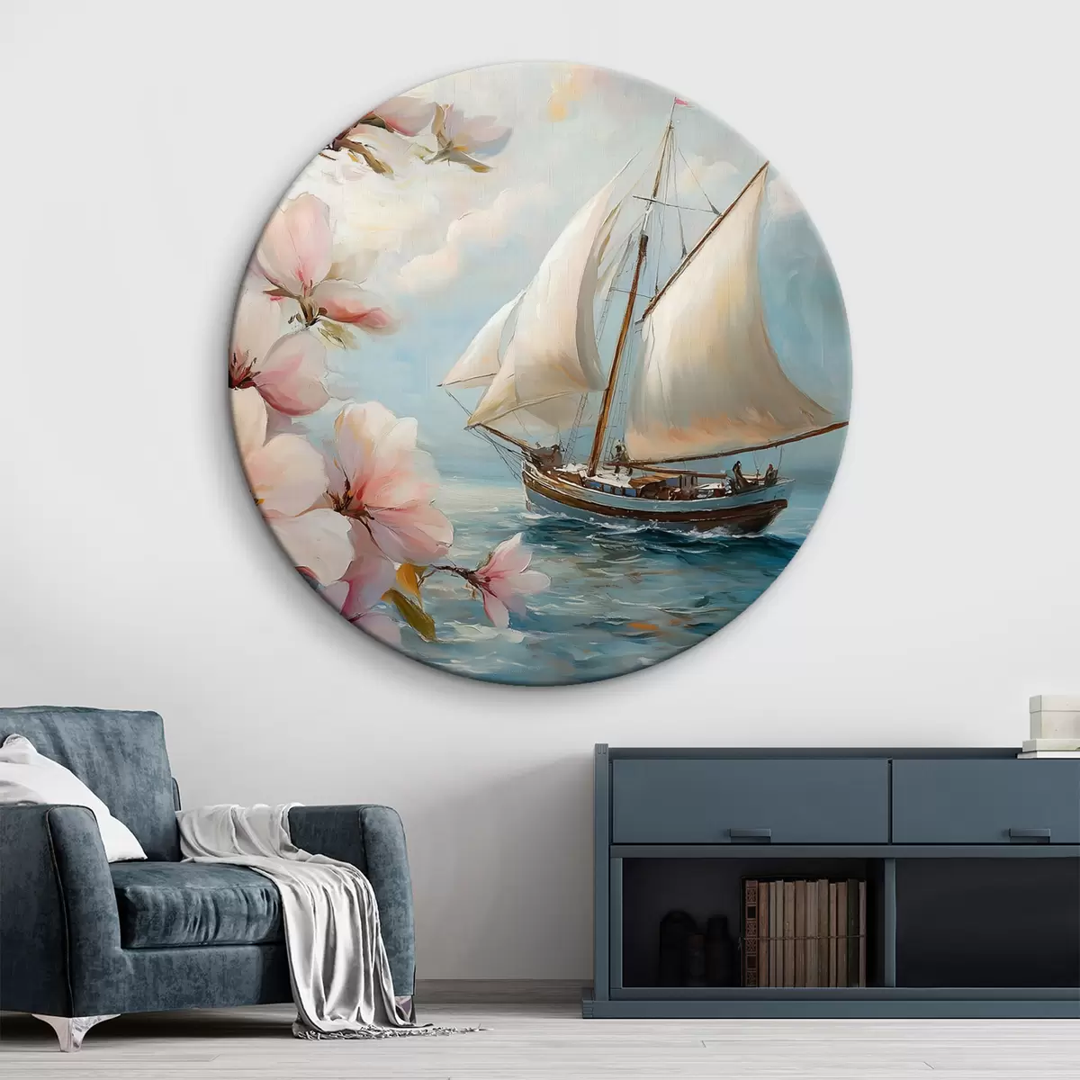 Кругла картина Човен на морі та великі квіти Nr r44330