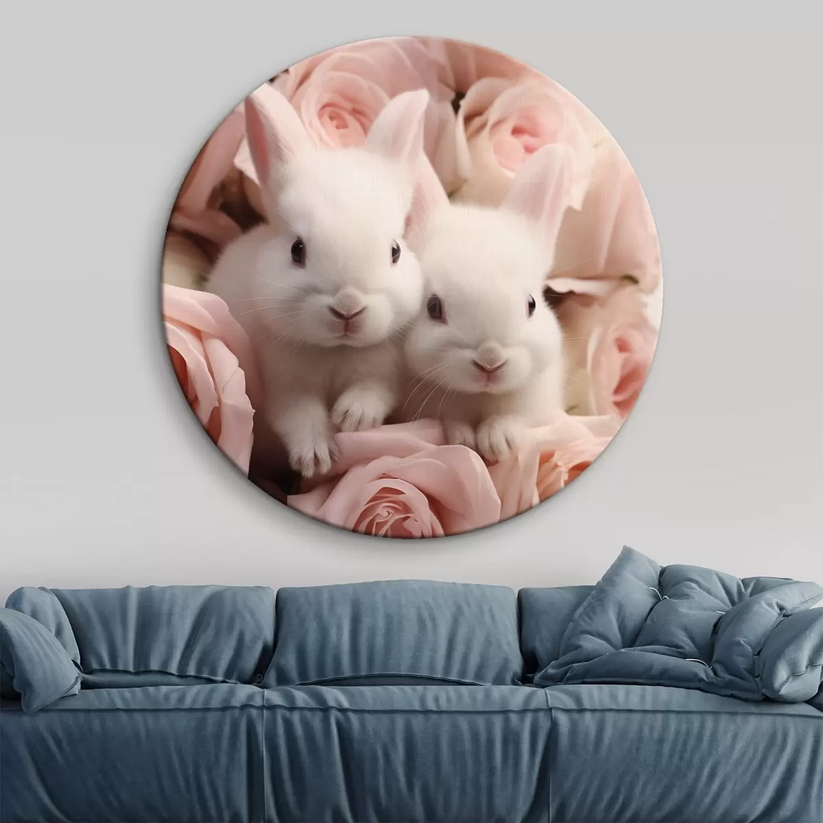 Кругла картина Два білих кролика в ніжних рожевих квітах Nr r44380