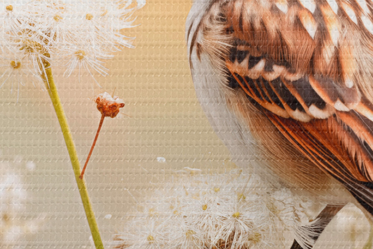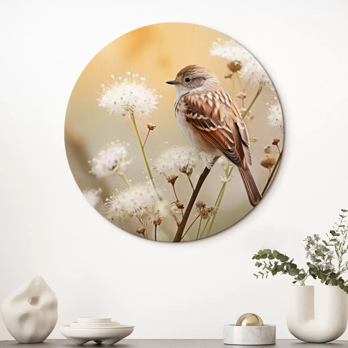 Кругла картина Птах, що сидить на гілці з білими квітами, м'який фокус, природний фон Nr r44393