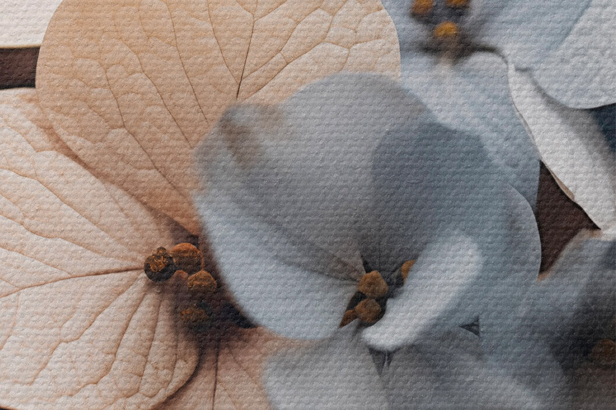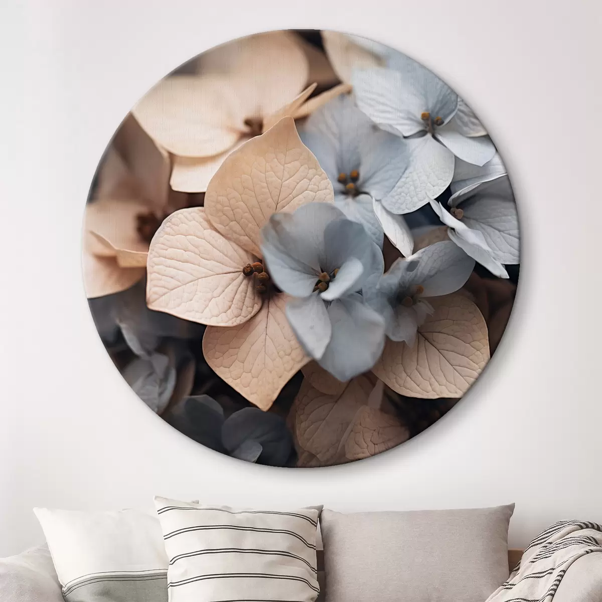 Кругла картина Квіти гортензії, світло-блакитні та бежеві пелюстки, з детальною текстурою, елегантна квіткова композиція Nr r44394