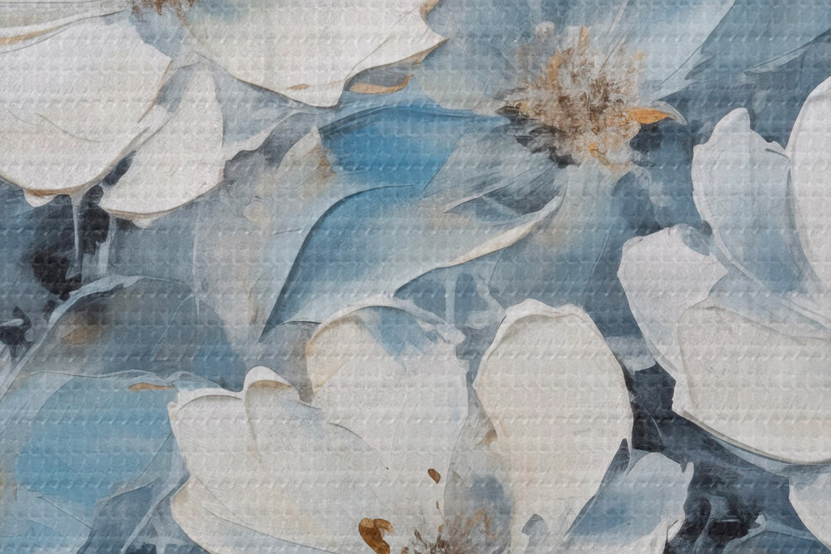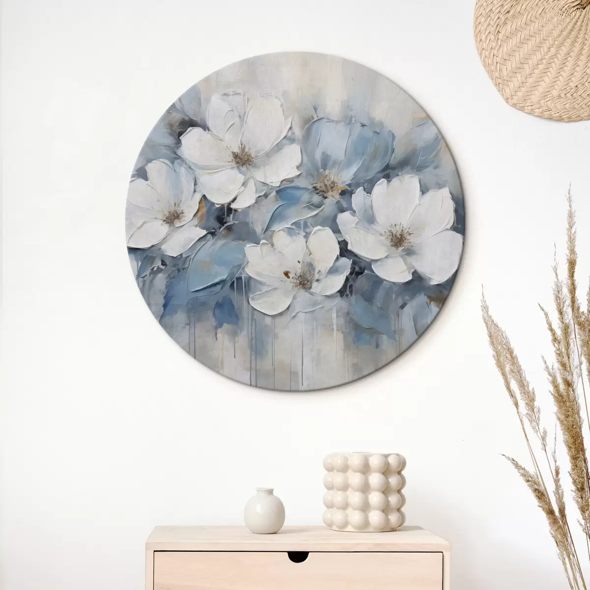 Кругла картина Білі квіти з блакитним листям, на світло-бежевому тлі, з видимими мазками пензля r44395