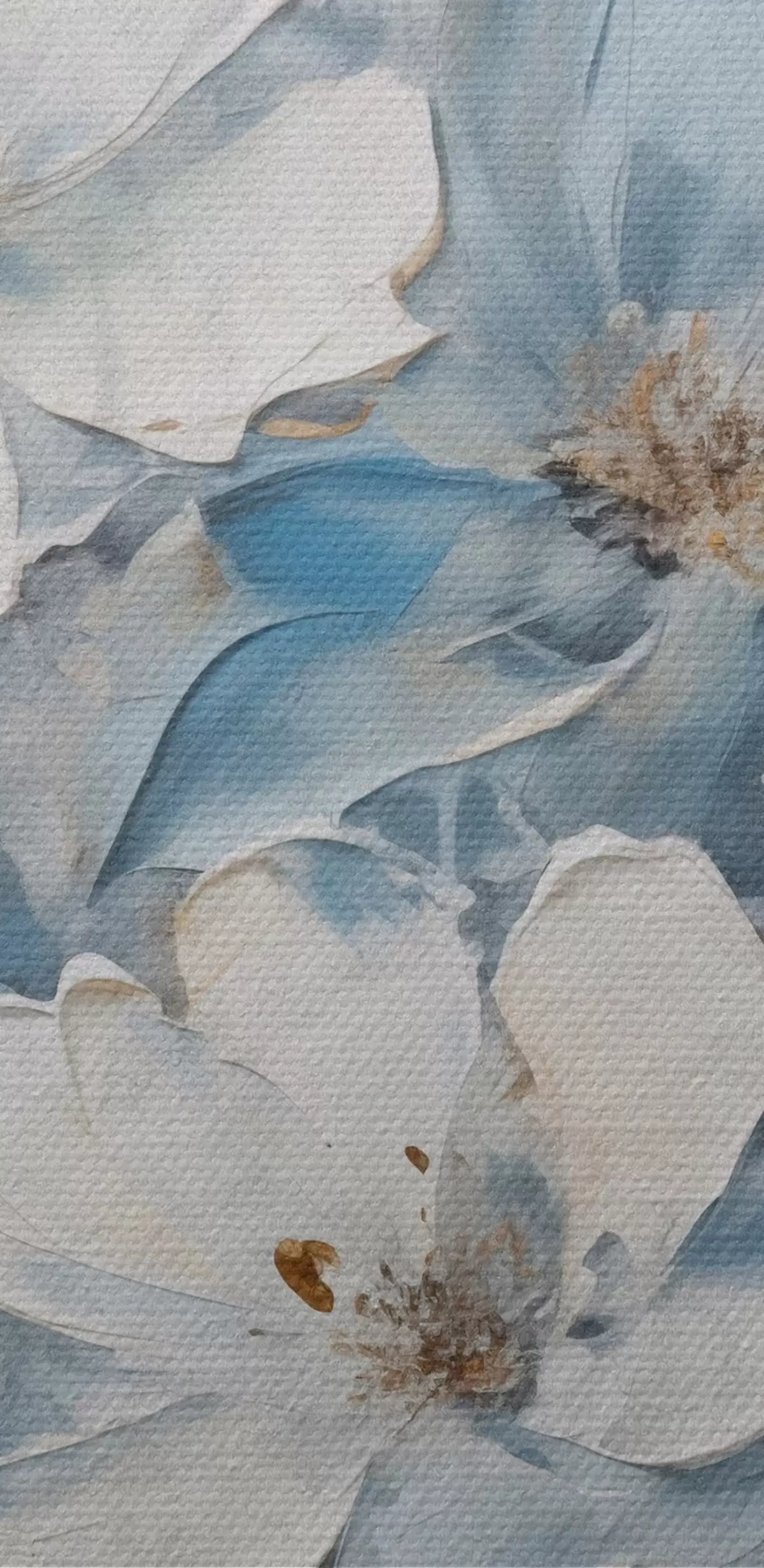 Кругла картина Білі квіти з блакитним листям, на світло-бежевому тлі, з видимими мазками пензля r44395