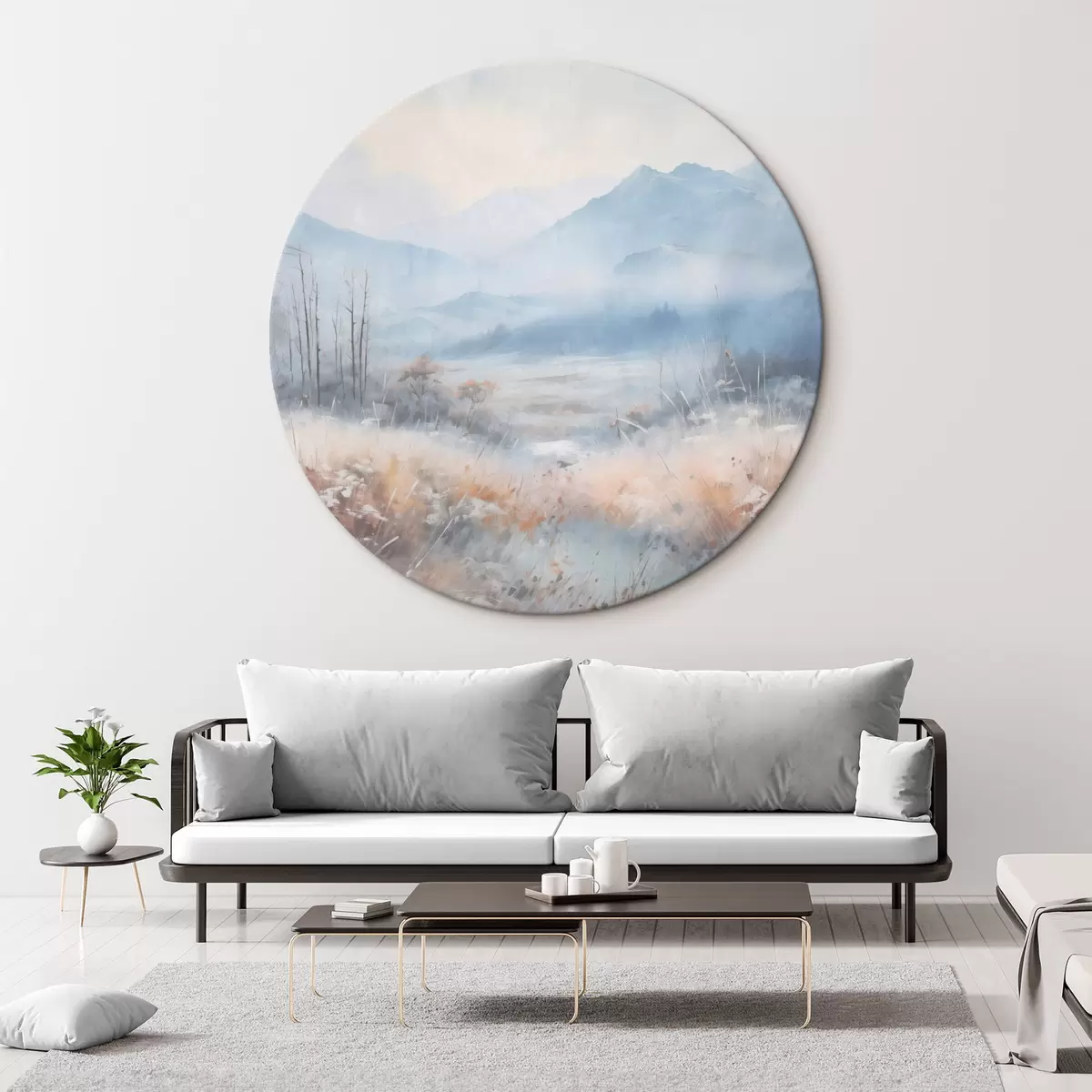 Кругла картина Текстурований пейзаж з горами, сухою травою та лісом, приглушені кольори Nr r44402