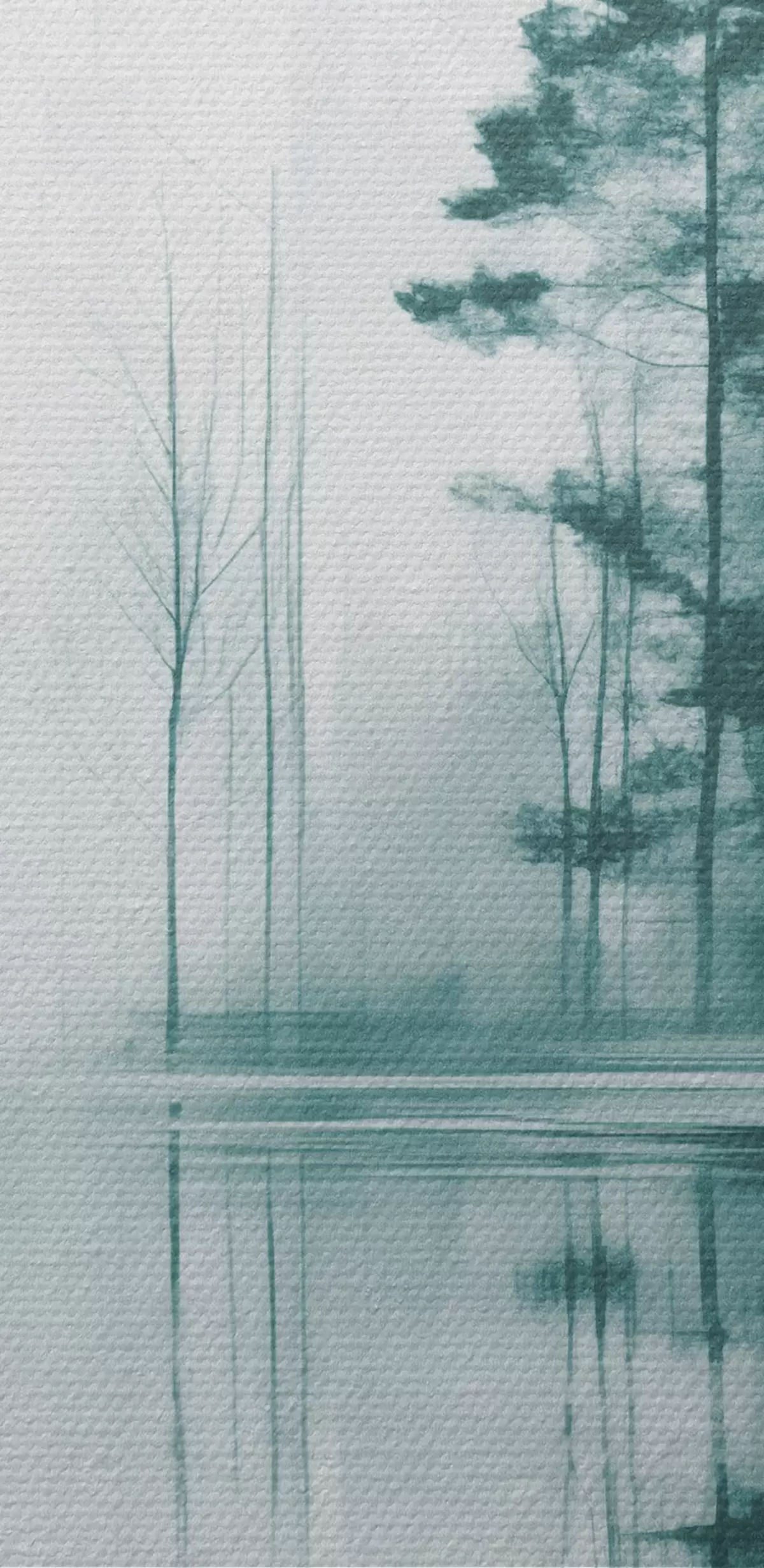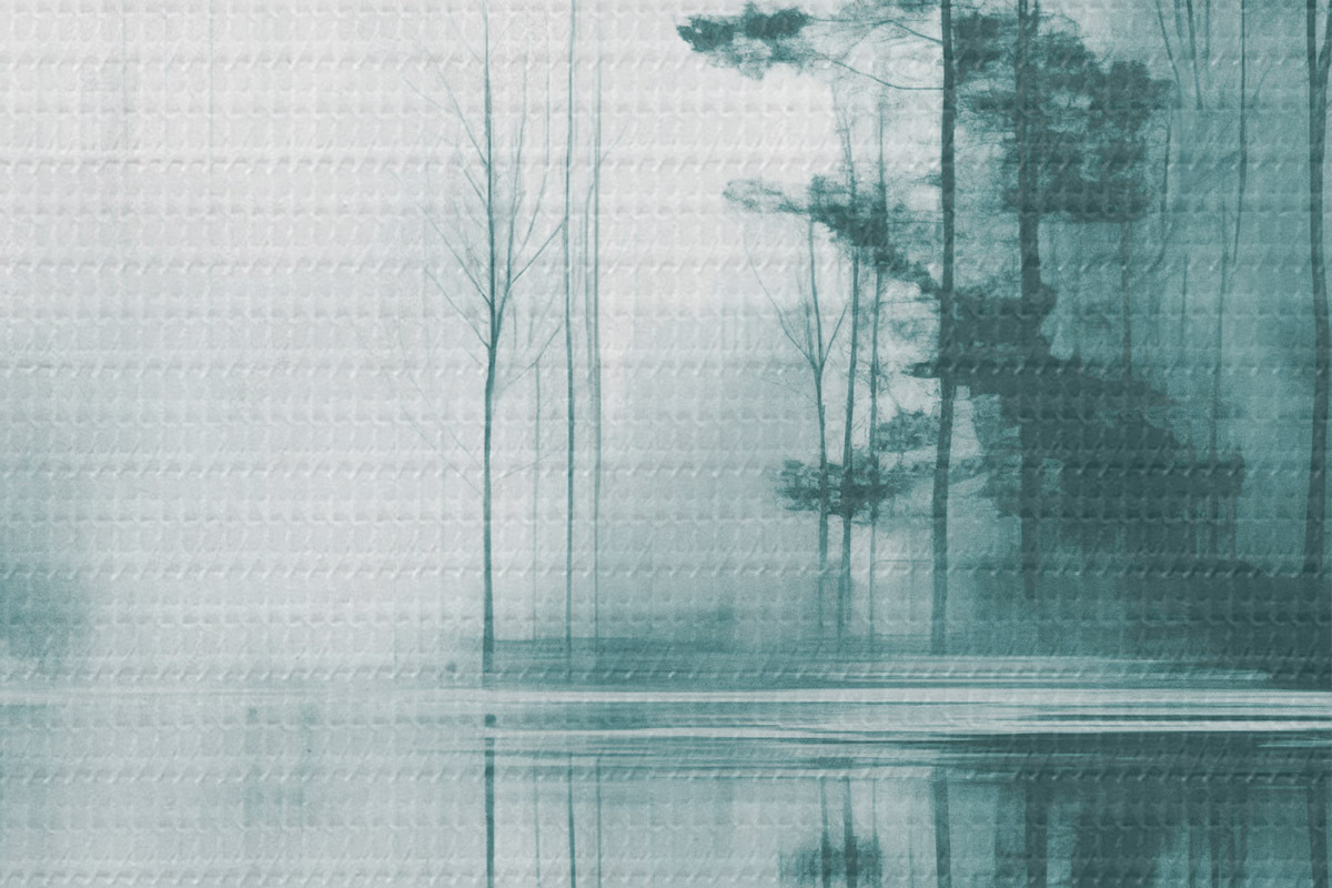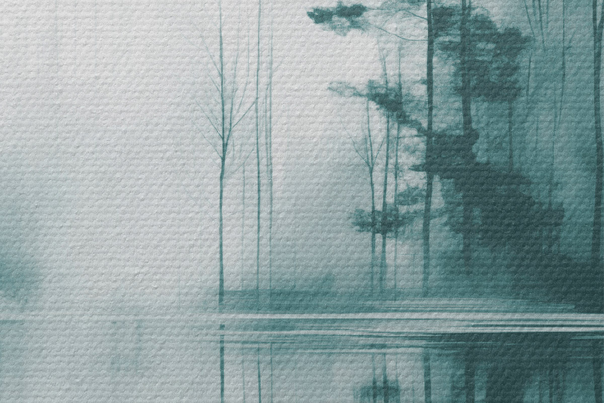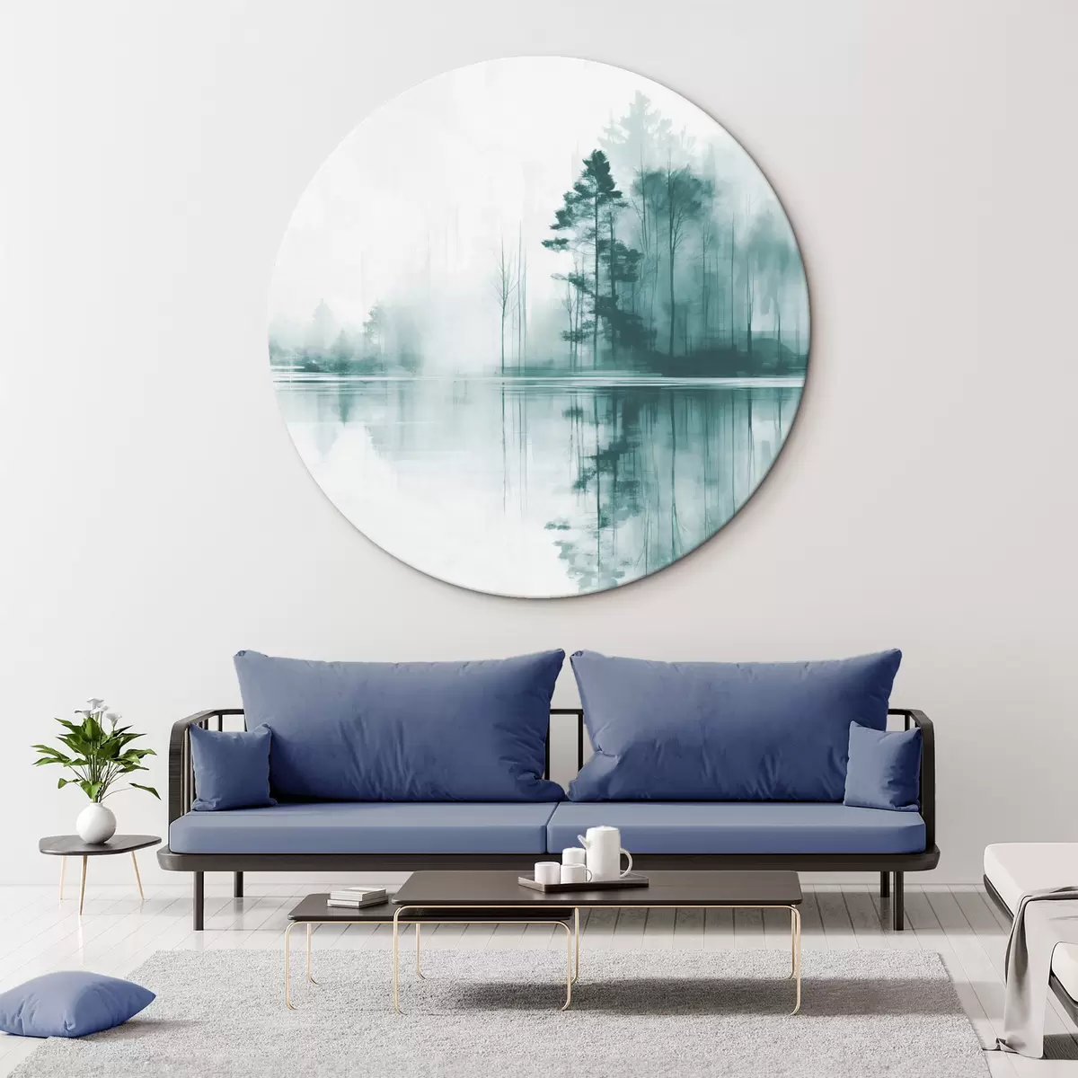 Кругла картина Абстрактний ліс з високими деревами, що віддзеркалюються у воді, приглушена кольорова палітра Nr r44403