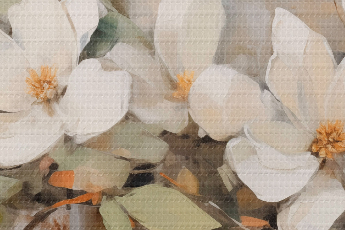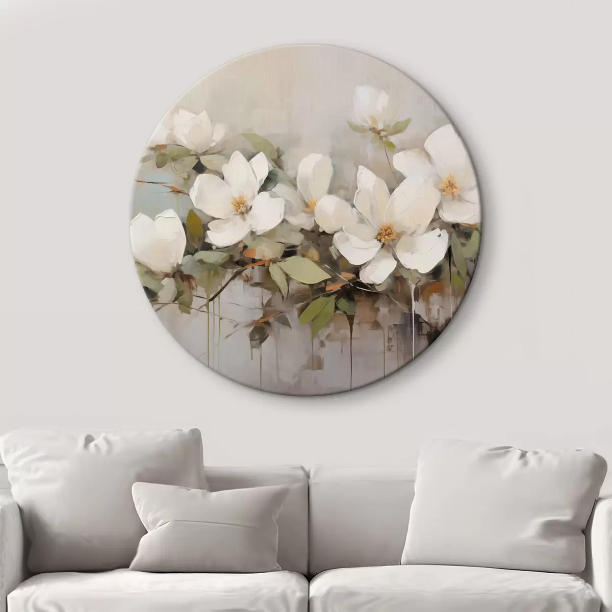 Кругла картина Білі квіти магнолії з зеленим листям на гілці, м'які мазки, приглушені кольори r44404