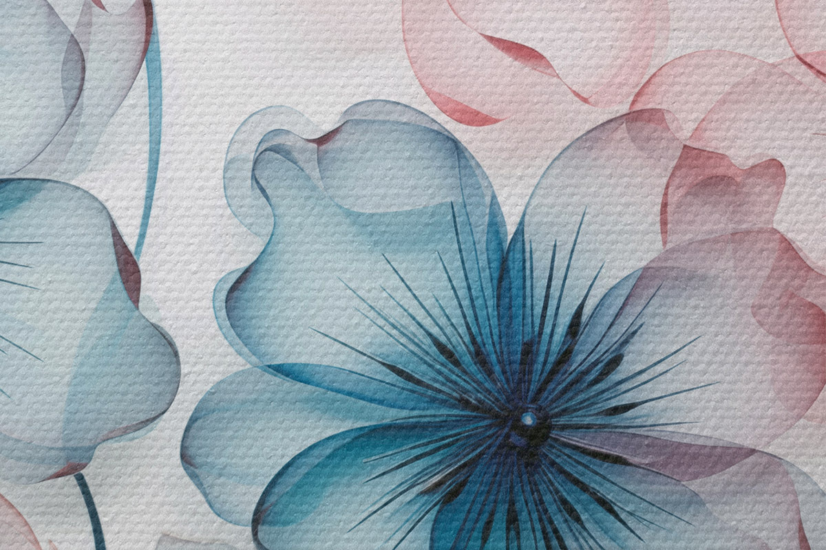 Кругла картина Напівпрозорі приглушені рожеві та блакитні квіти з видимими тичинками та стеблами r44405