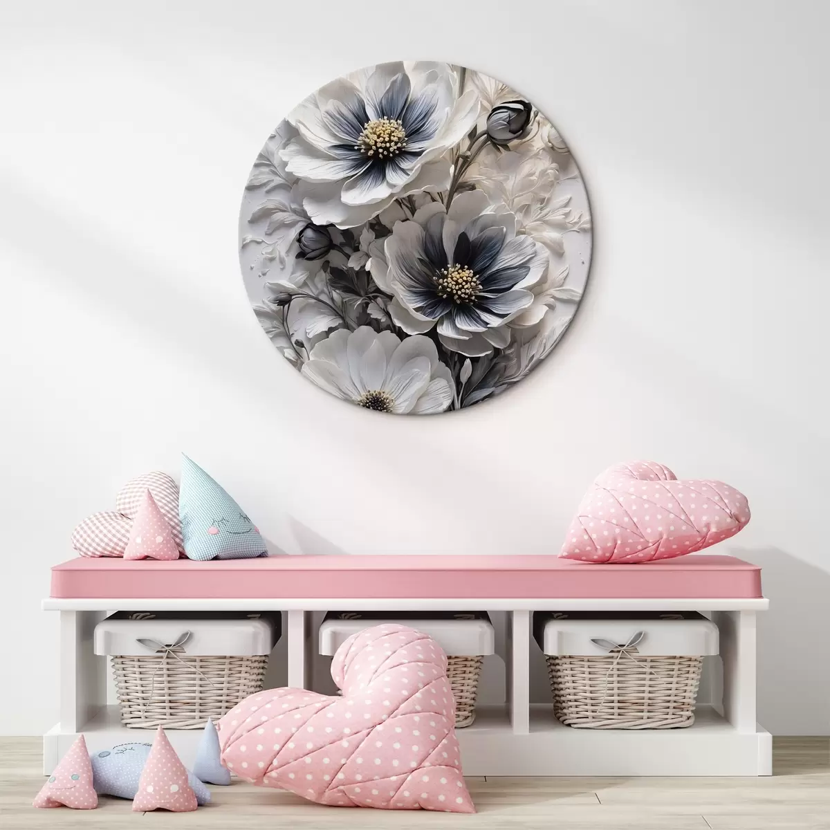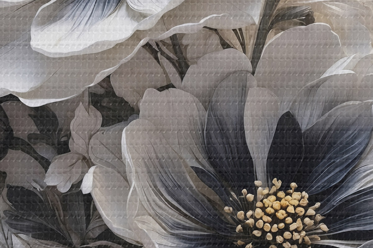 Кругла картина Чорно-білі квіти на білому тлі Nr r44446