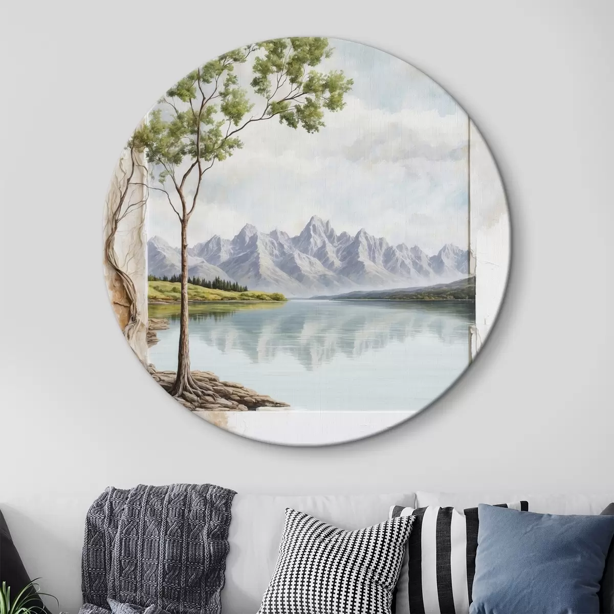 Кругла картина Вид на озеро та засніжені гори в кадрі r44458