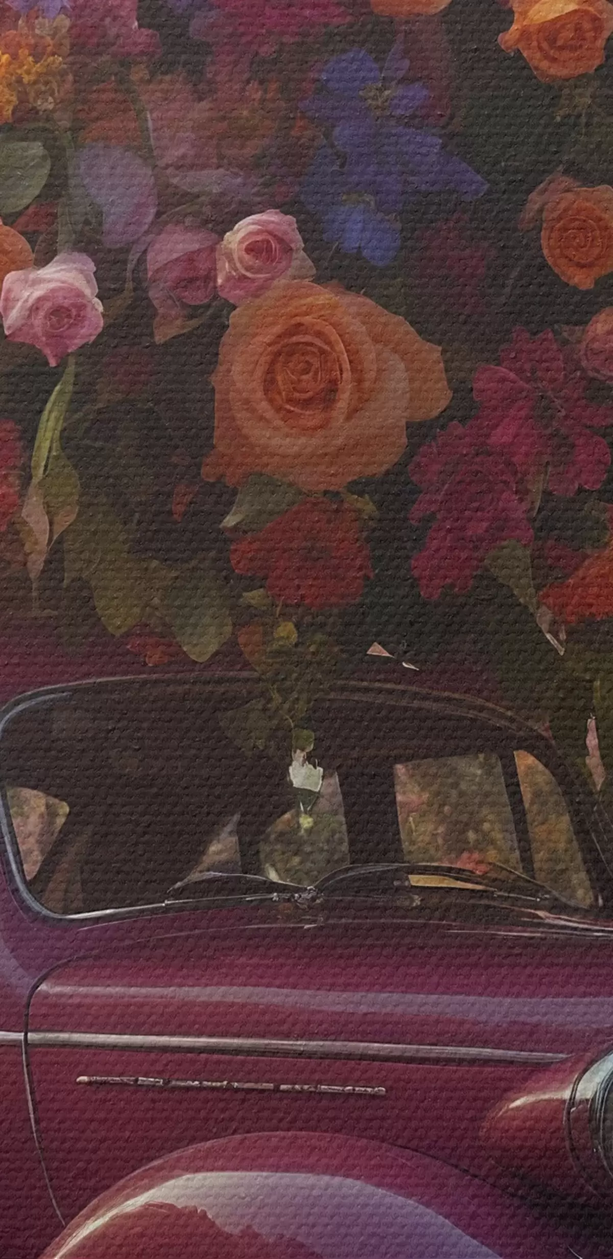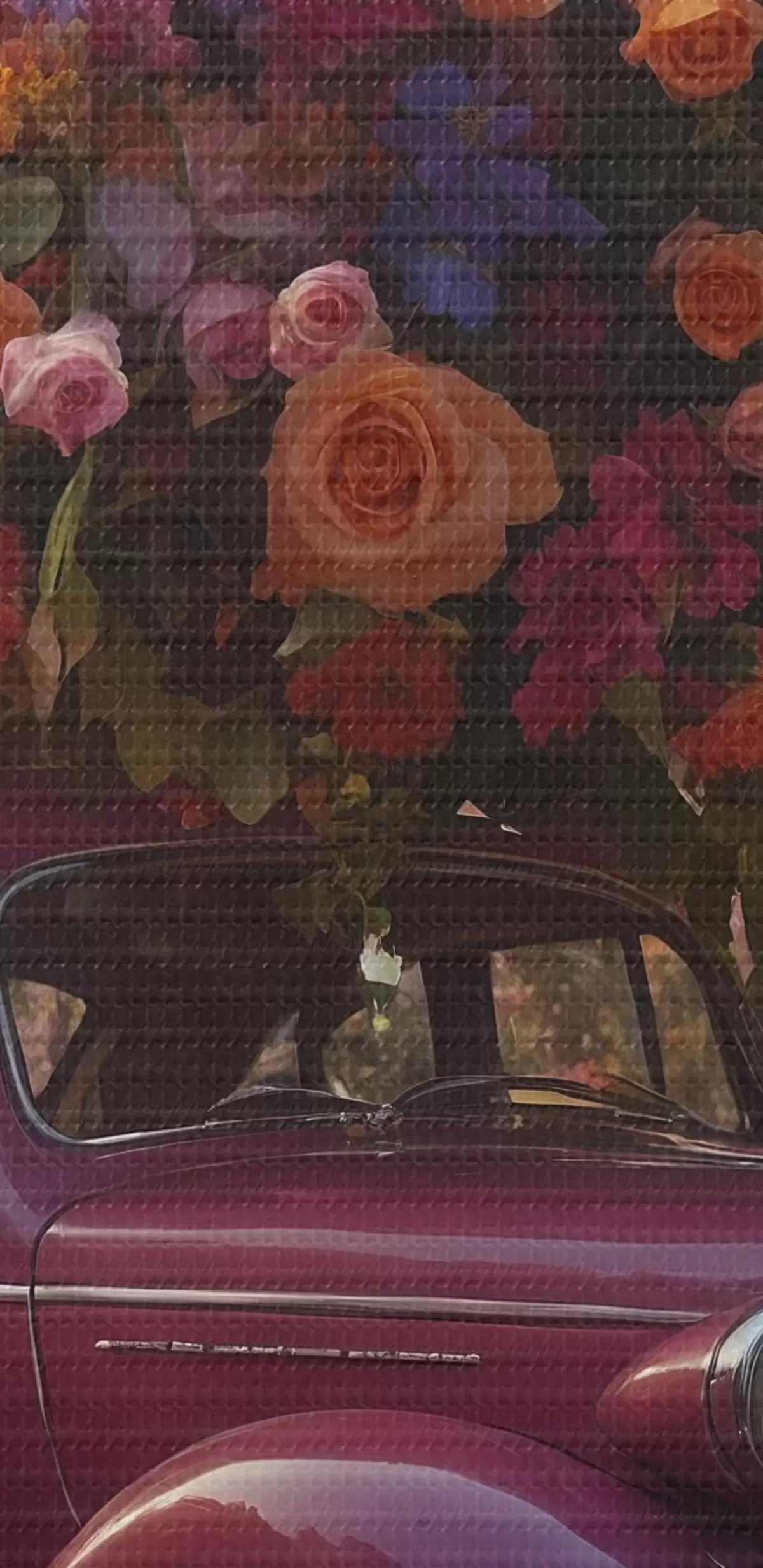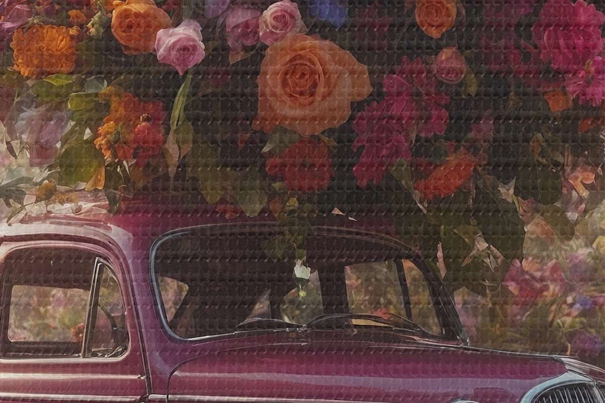 Кругла картина Ретро-автомобіль і величезний букет квітів r44471