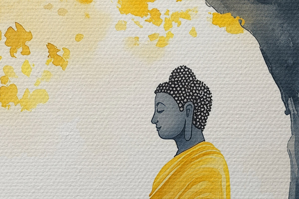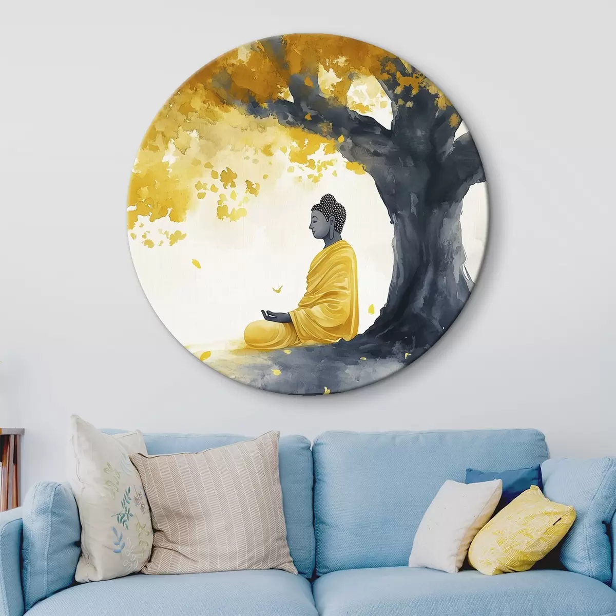 Кругла картина Будда, що медитує під деревом, жовто-сірі кольори r44509