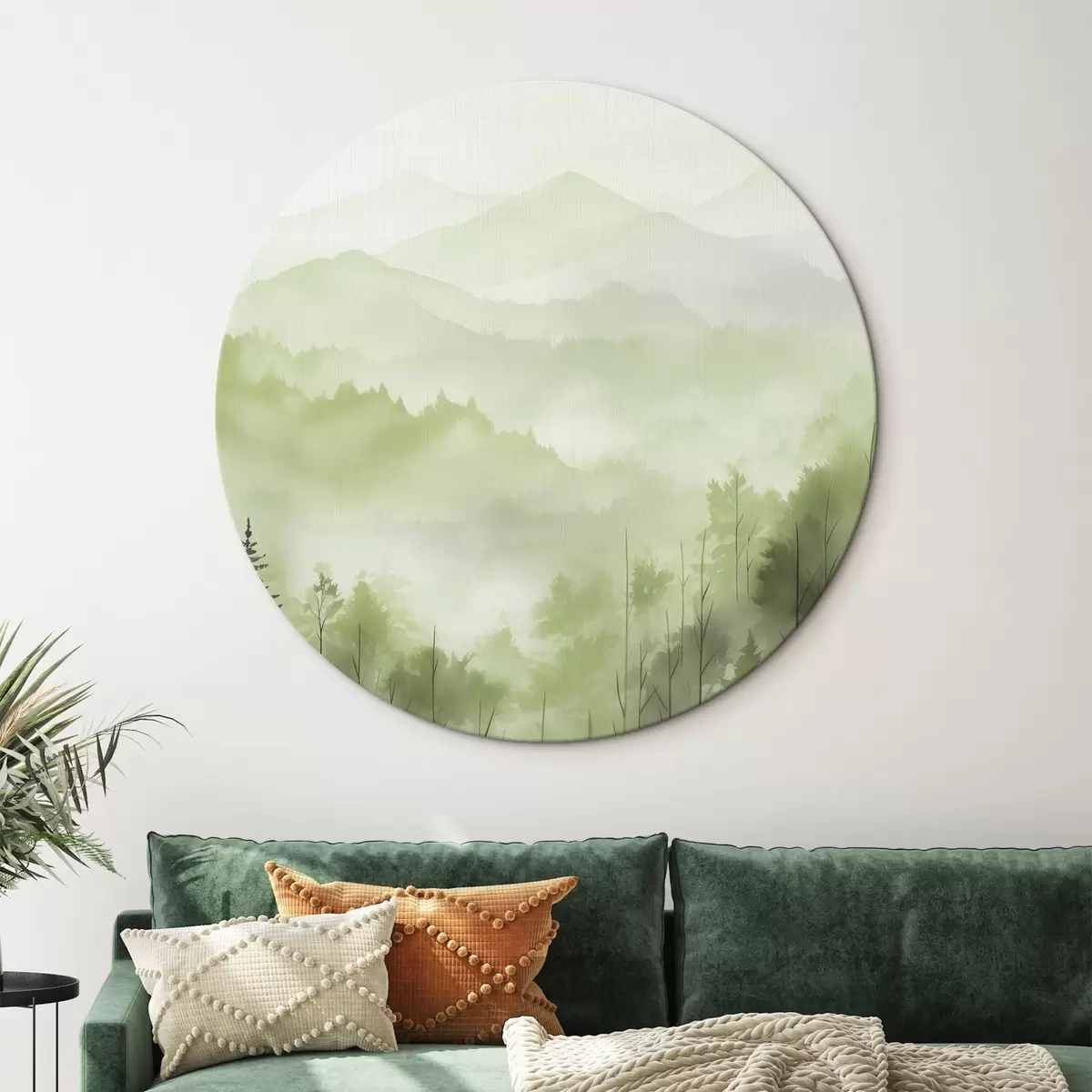 Кругла картина Гори з лісовим пейзажем, зелені кольори, акварельний стиль Nr r44606