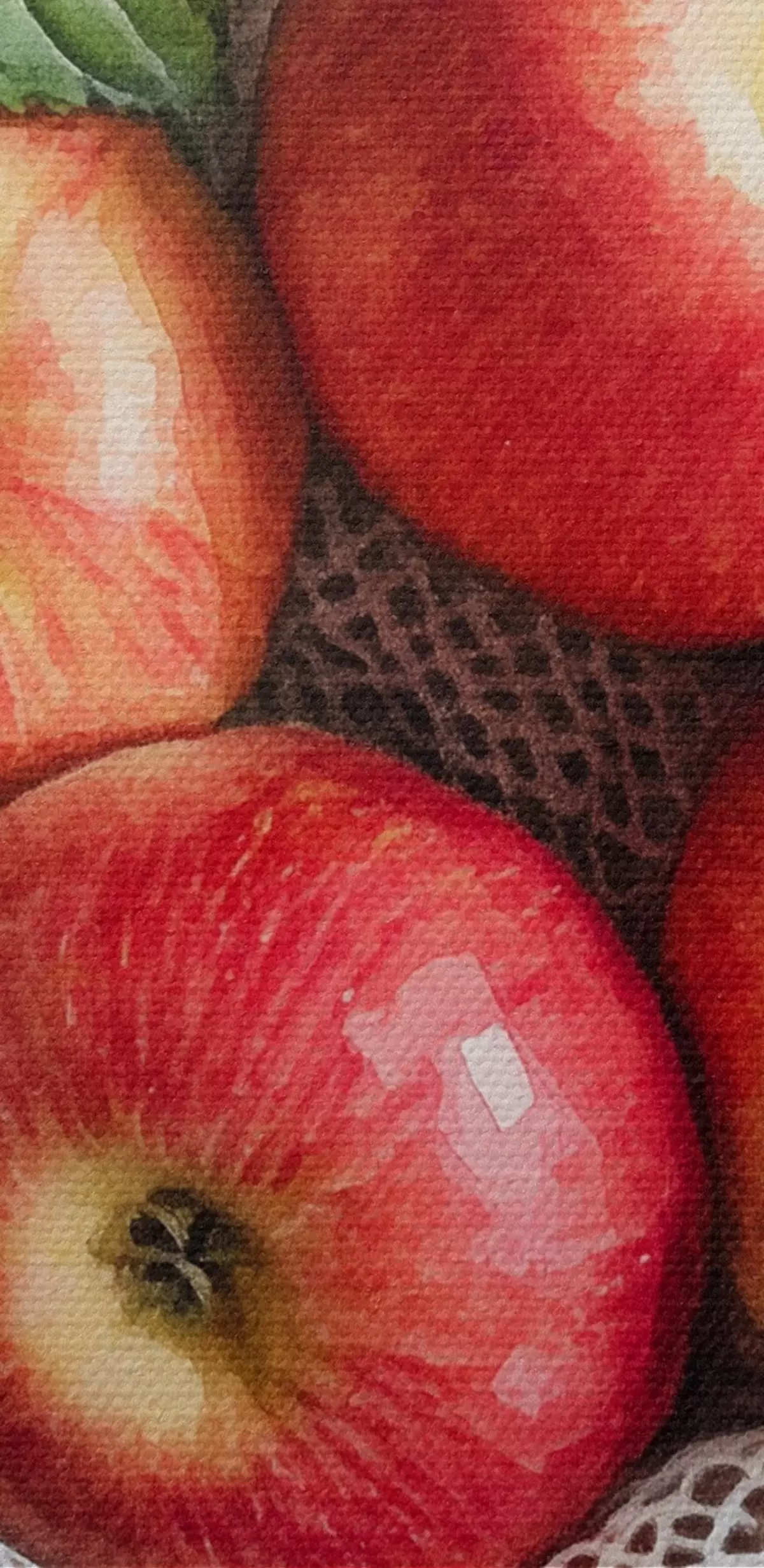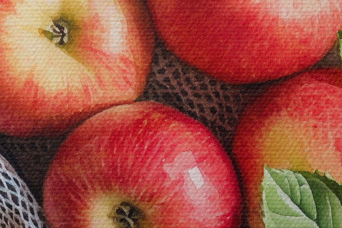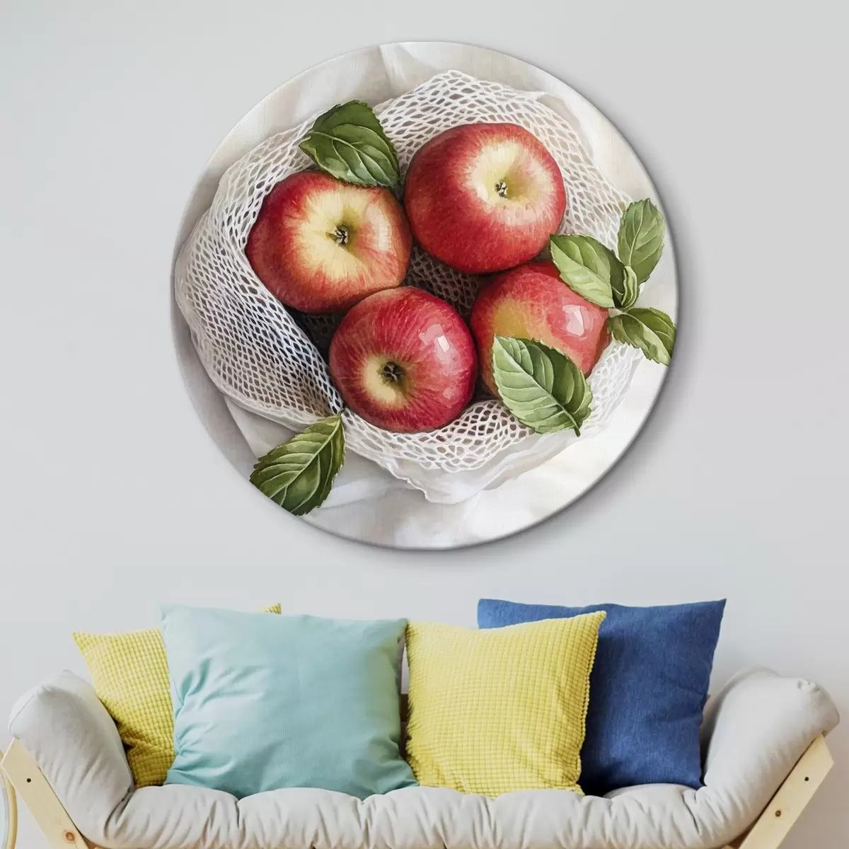 Кругла картина Червоні яблука в лляній торбинці з листям м'яти, сільський стиль, фрукти Nr r44609