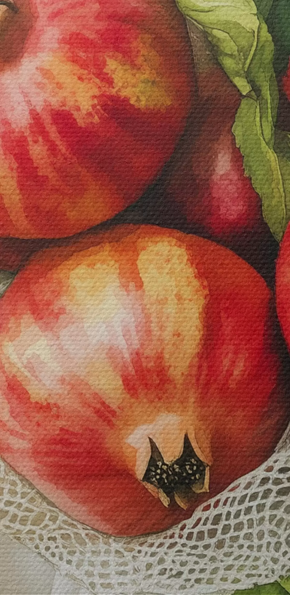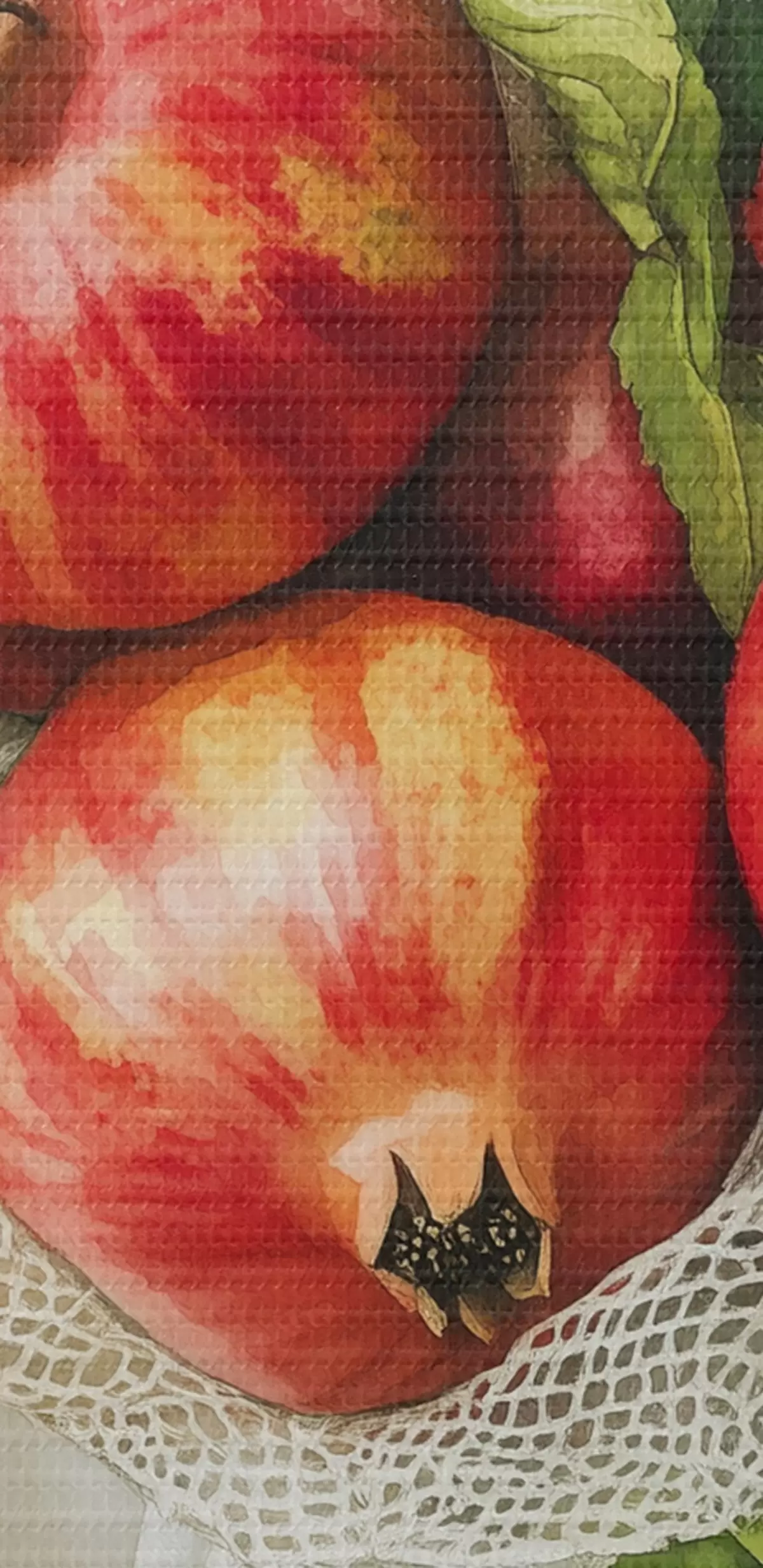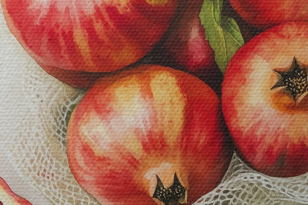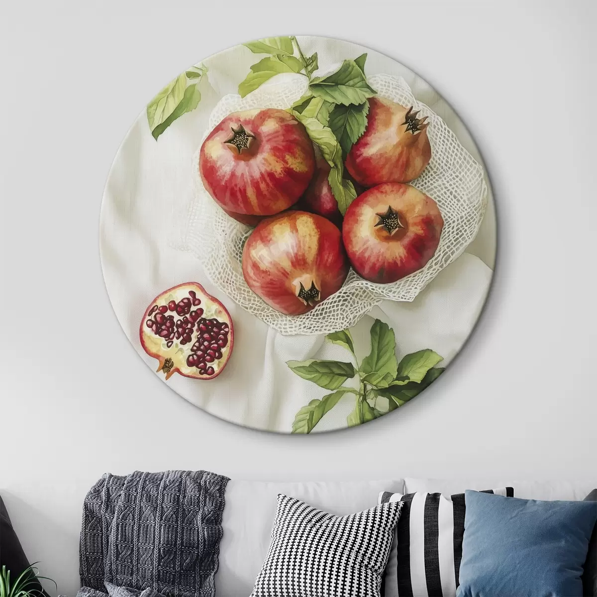 Кругла картина Гранати з листям м'яти на лляних скатертинах, сільський стиль Nr r44611