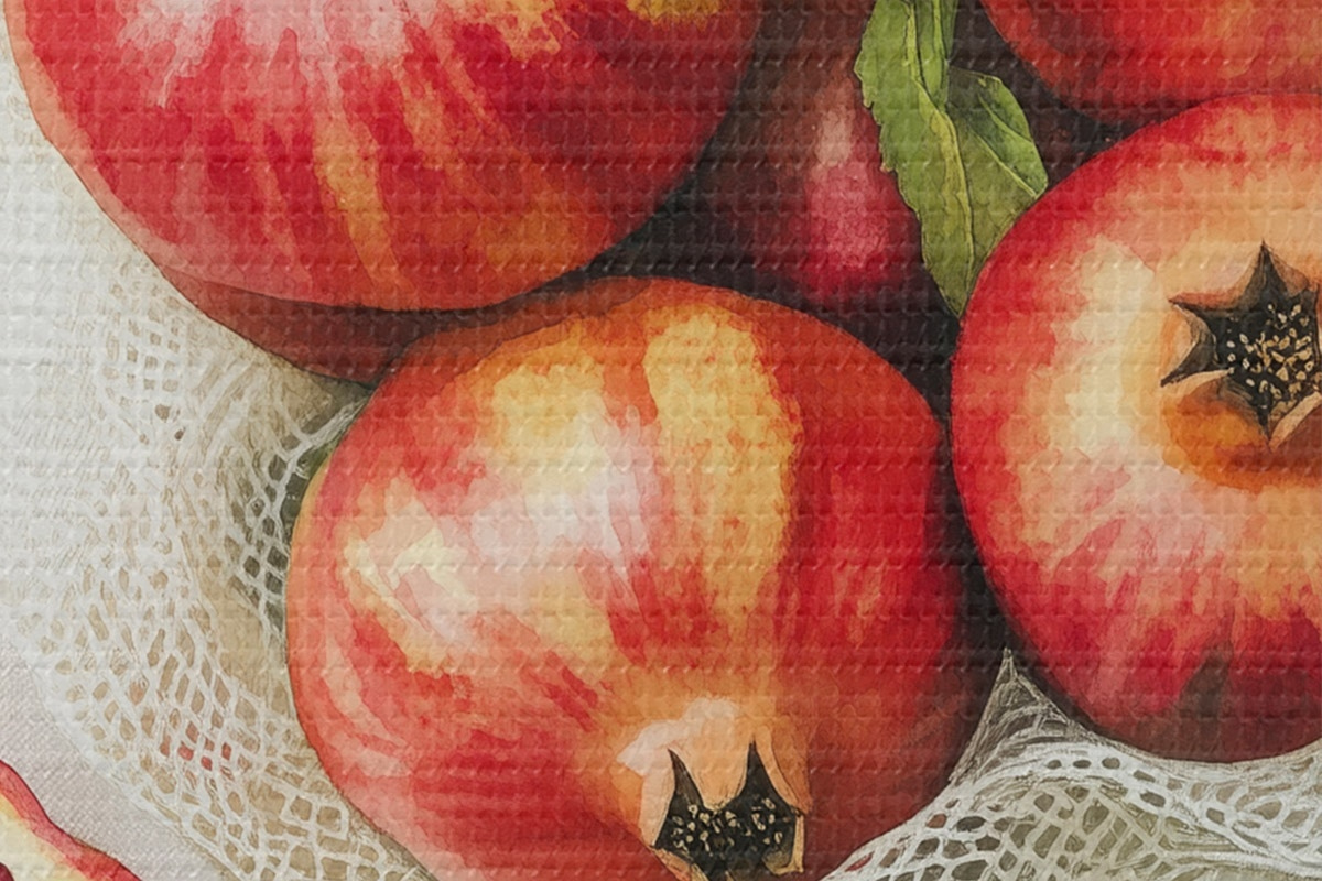 Кругла картина Гранати з листям м'яти на лляних скатертинах, сільський стиль r44611
