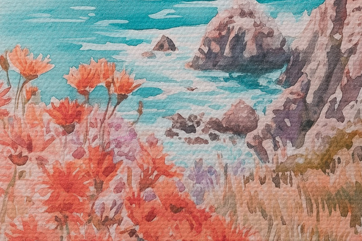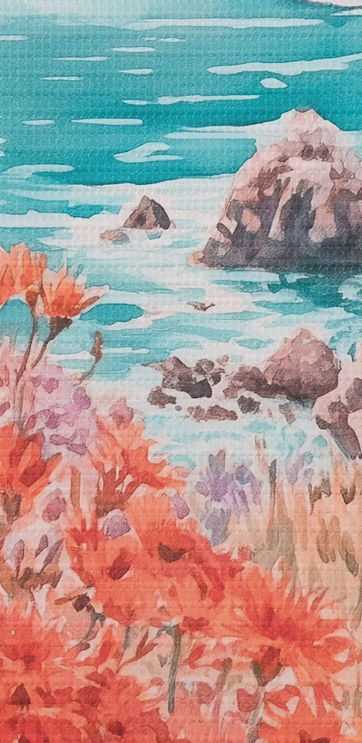 Кругла картина Португальське узбережжя океану на заході сонця, лугові квіти r44612