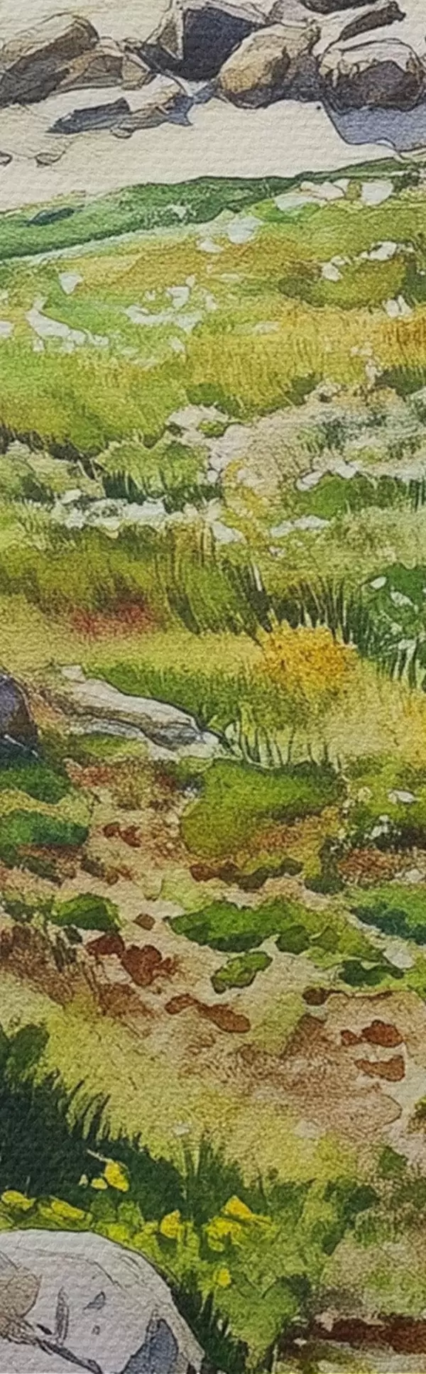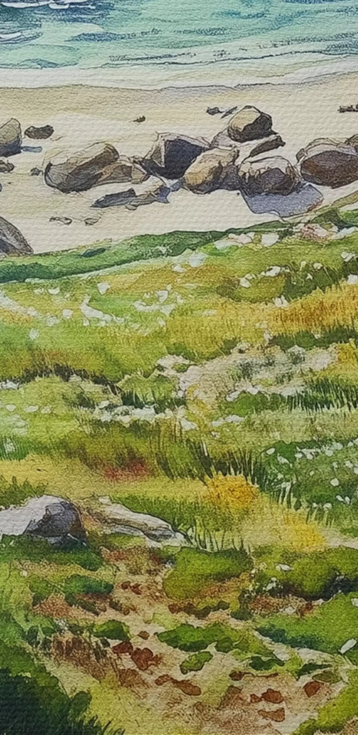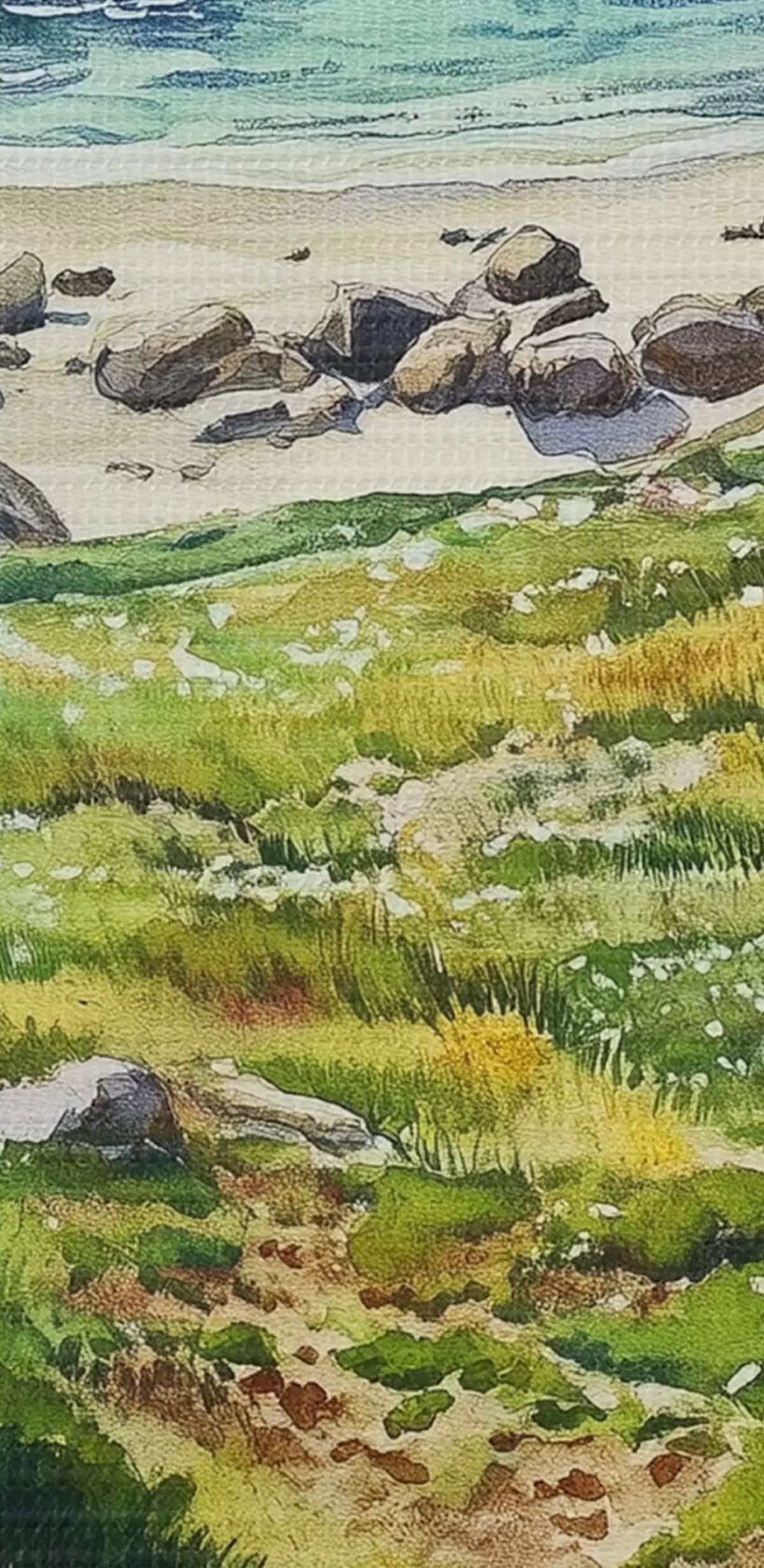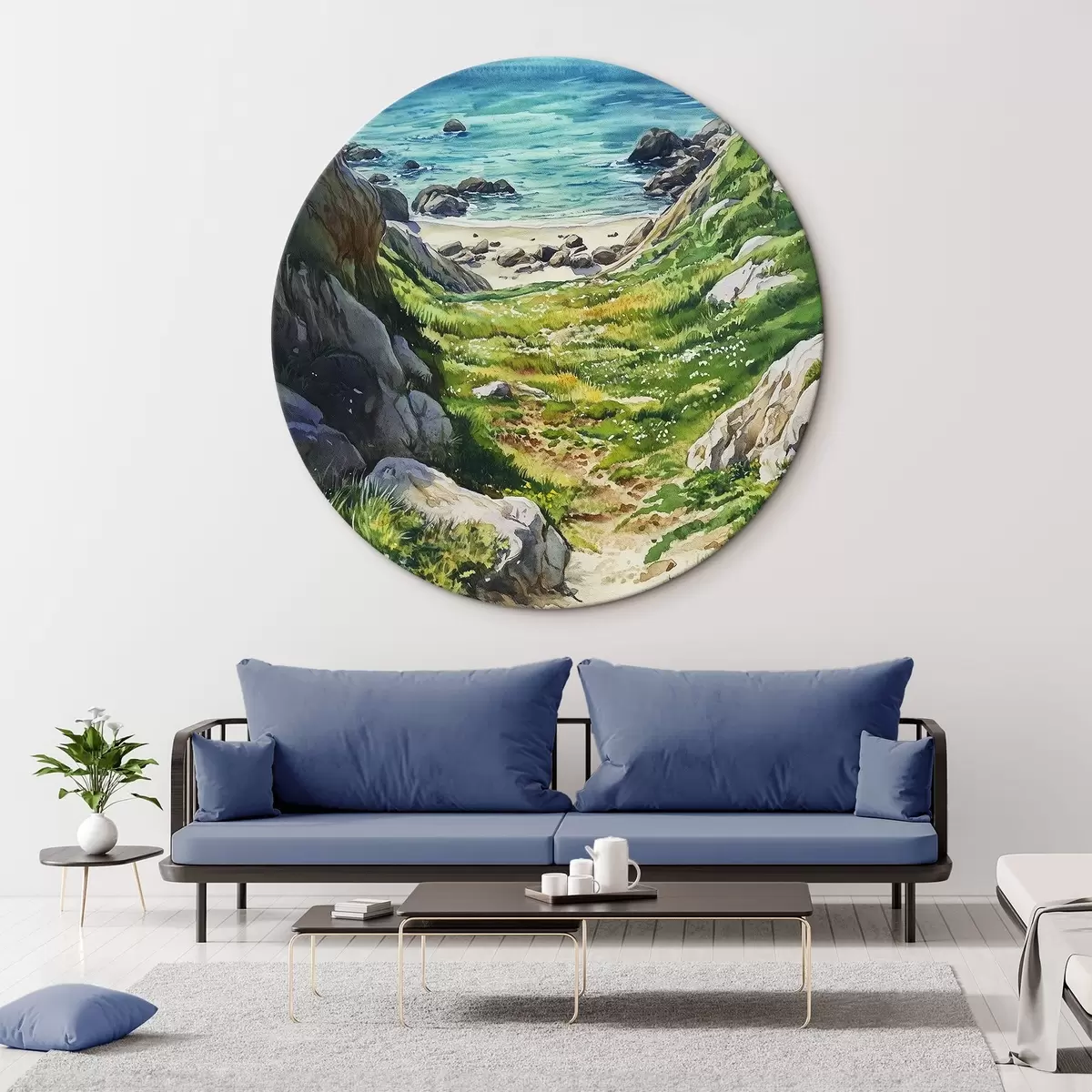 Кругла картина Морське узбережжя зі скелями та зеленою травою, акварельний стиль, літо Nr r44616