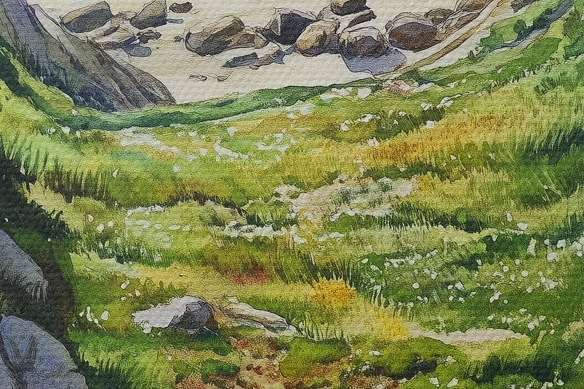 Кругла картина Морське узбережжя зі скелями та зеленою травою, акварельний стиль, літо r44616