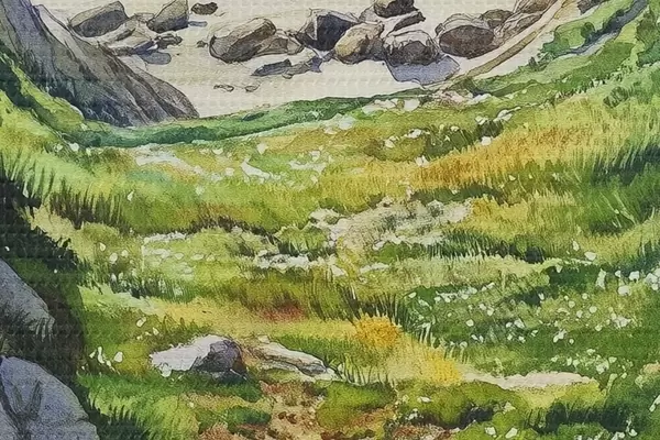 Кругла картина Морське узбережжя зі скелями та зеленою травою, акварельний стиль, літо r44616