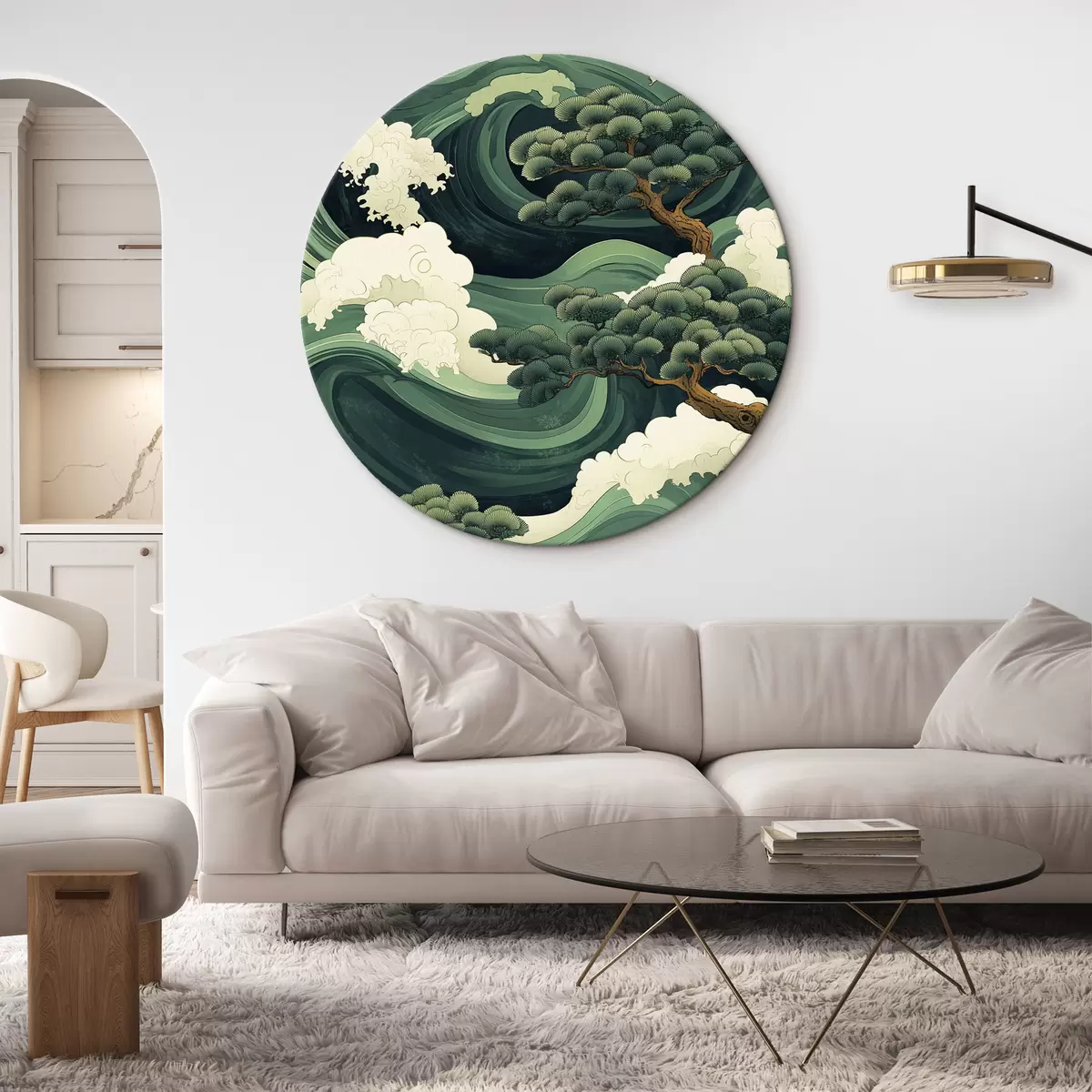 Кругла картина Малюнок у китайському стилі з морськими хвилями та соснами Nr r44719
