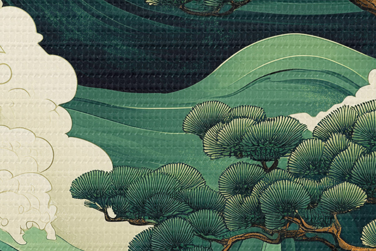 Кругла картина Малюнок у китайському стилі з морськими хвилями та соснами r44719