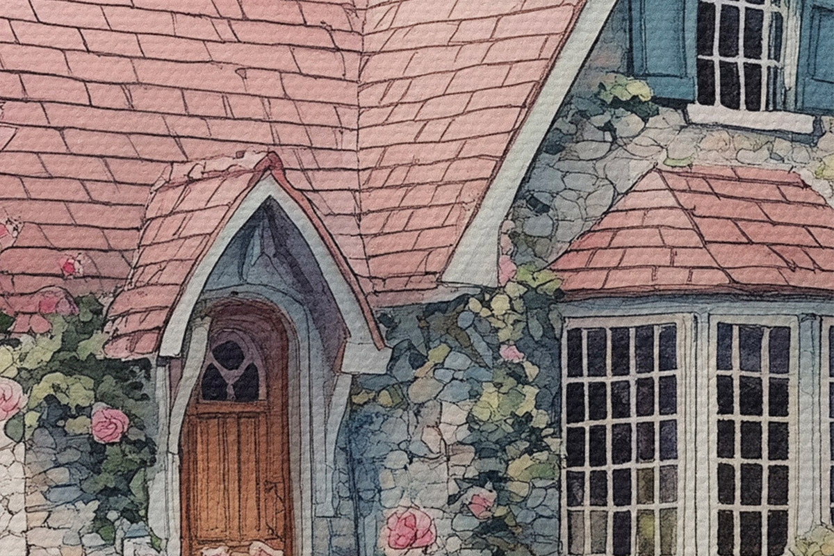 Кругла картина Гарний будинок серед беріз, сад з трояндами Nr r44721