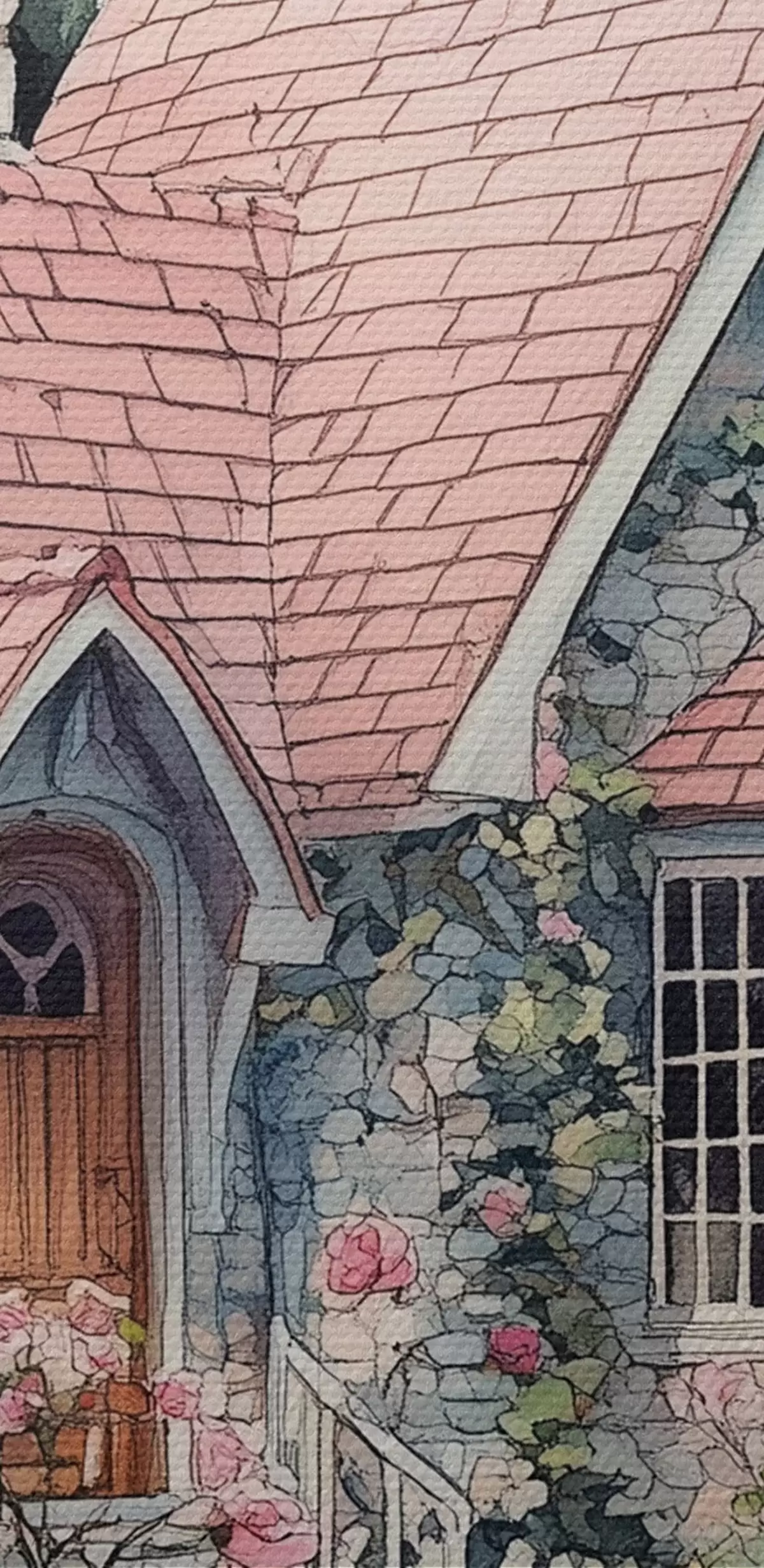 Кругла картина Гарний будинок серед беріз, сад з трояндами Nr r44721