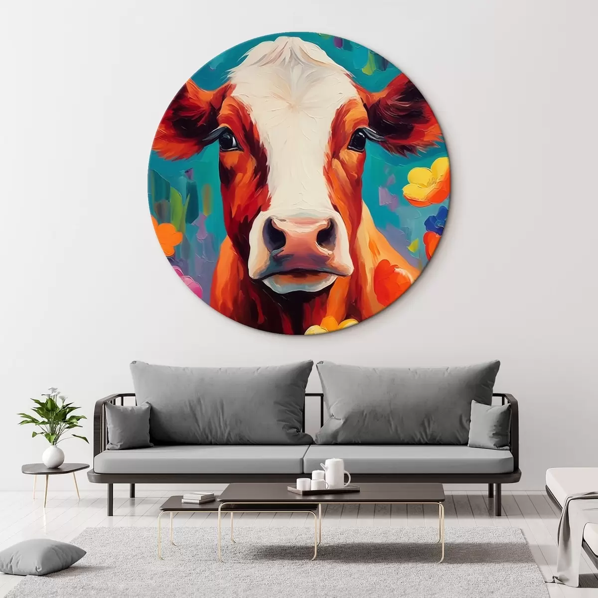 Кругла картина Корова серед квітів Nr r44803