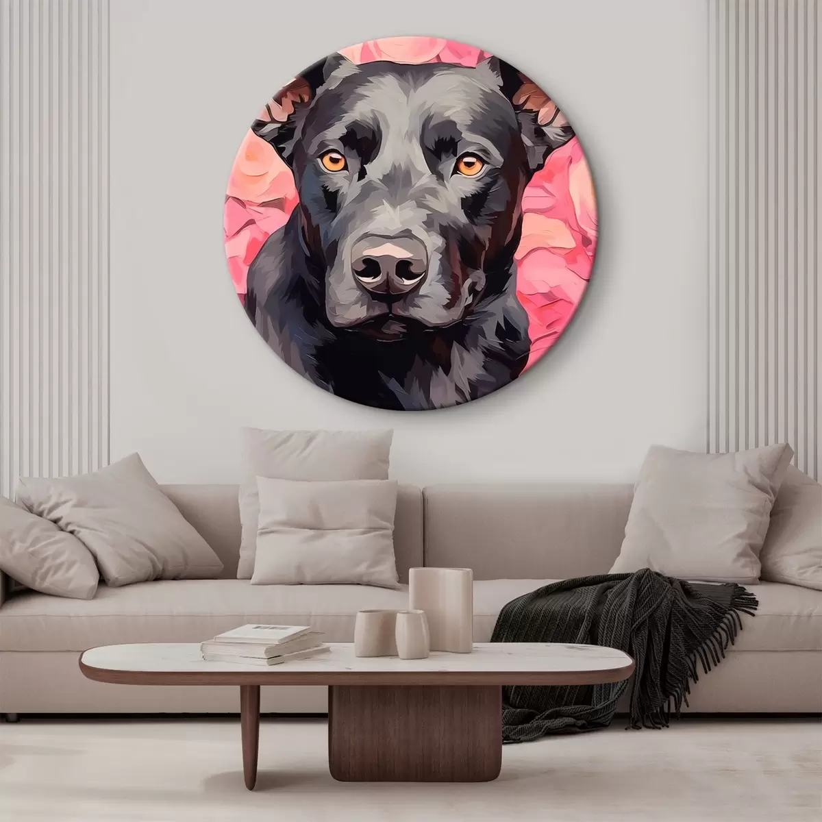Кругла картина Чорний пес на тлі абстрактних троянд Nr r44817