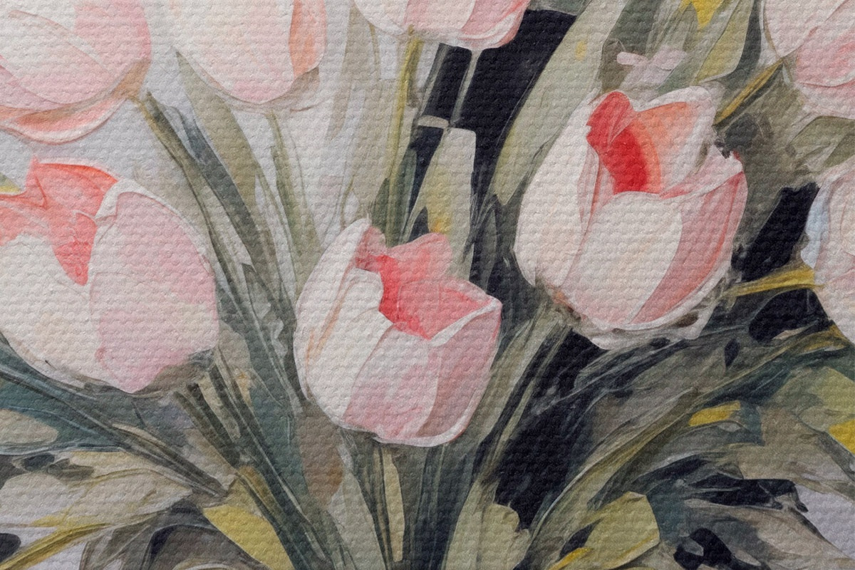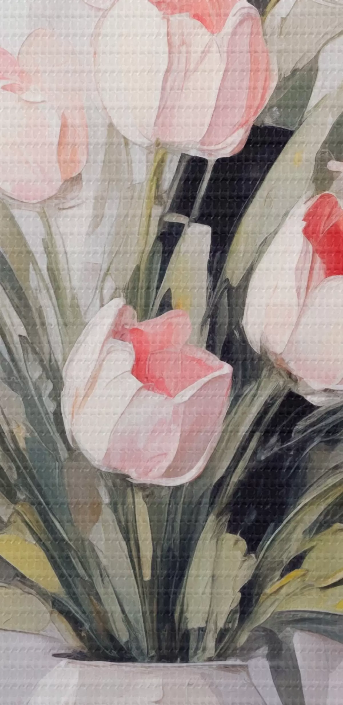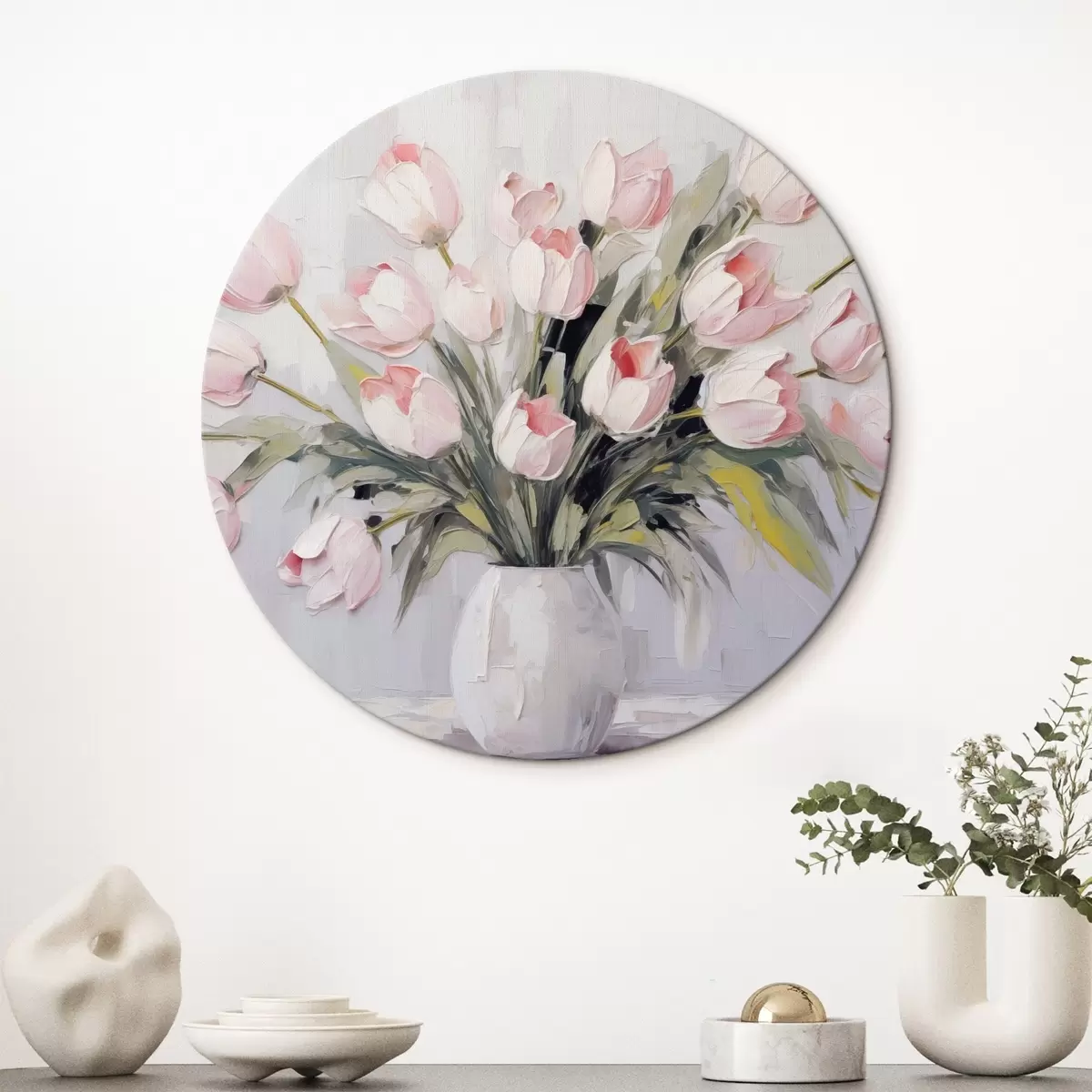 Кругла картина Ваза з рожевими тюльпанами, зелене листя, світло-сірий фон, олійний живопис, товсті мазки Nr r44852