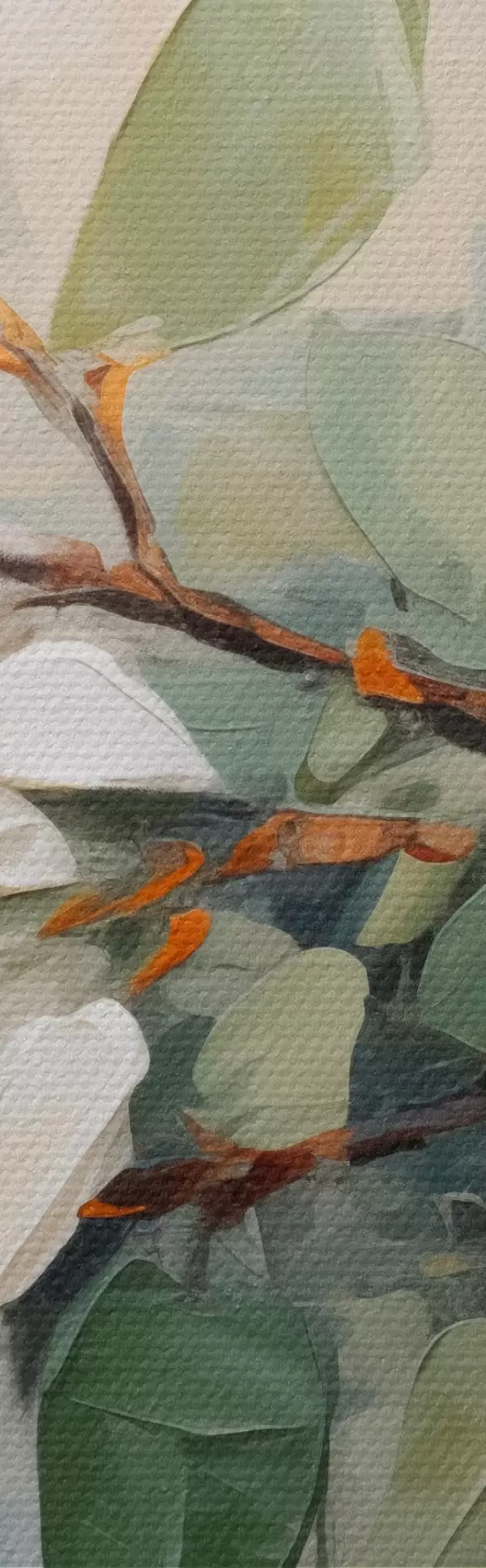Кругла картина Квіти магнолії з зеленим листям на гілці, фактурний стиль імпасто, м'яка кольорова палітра Nr r44853