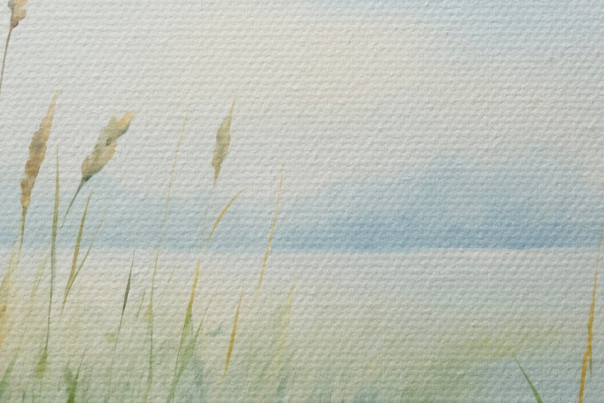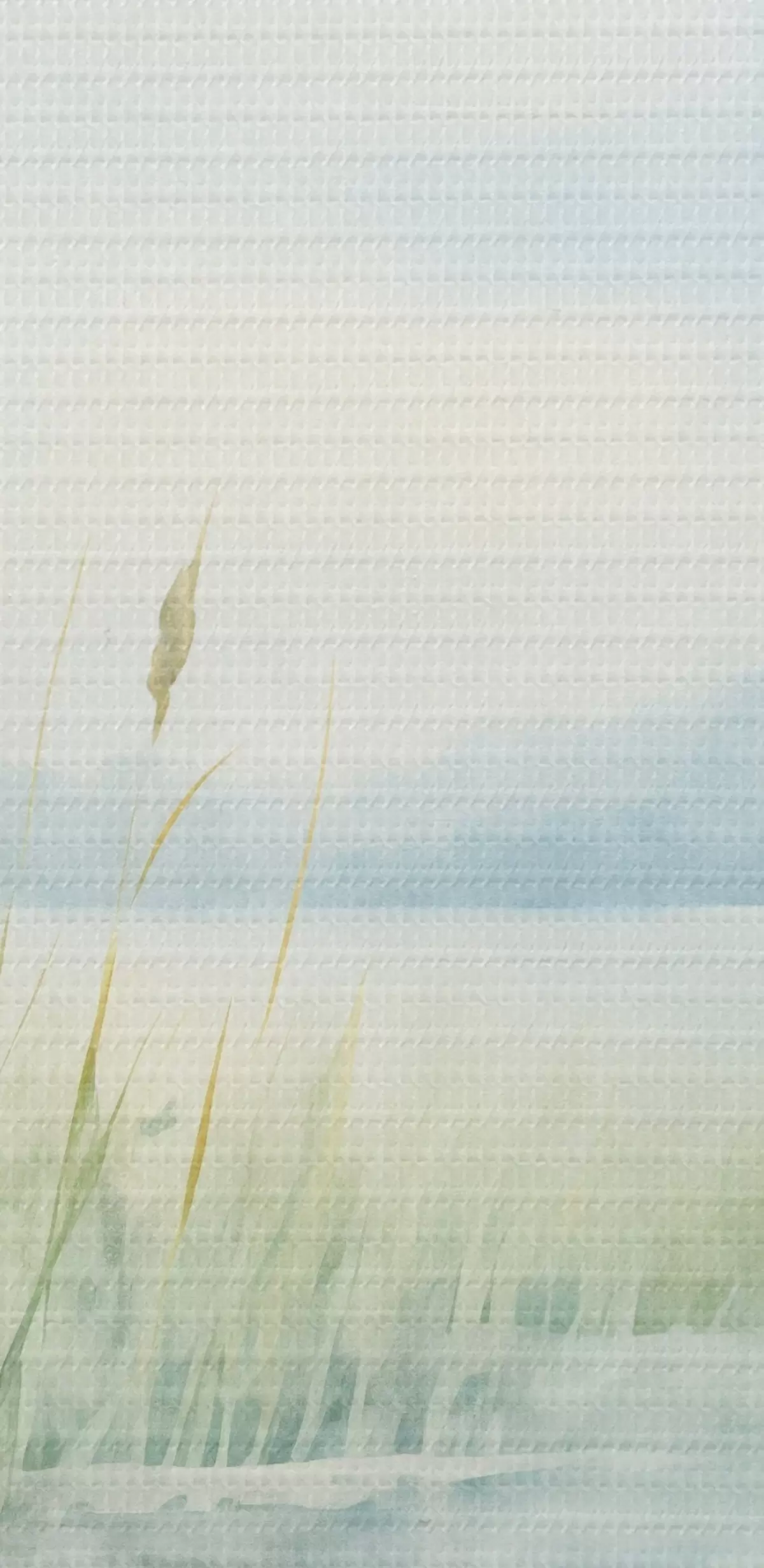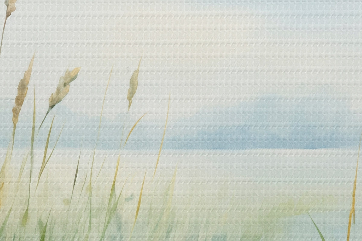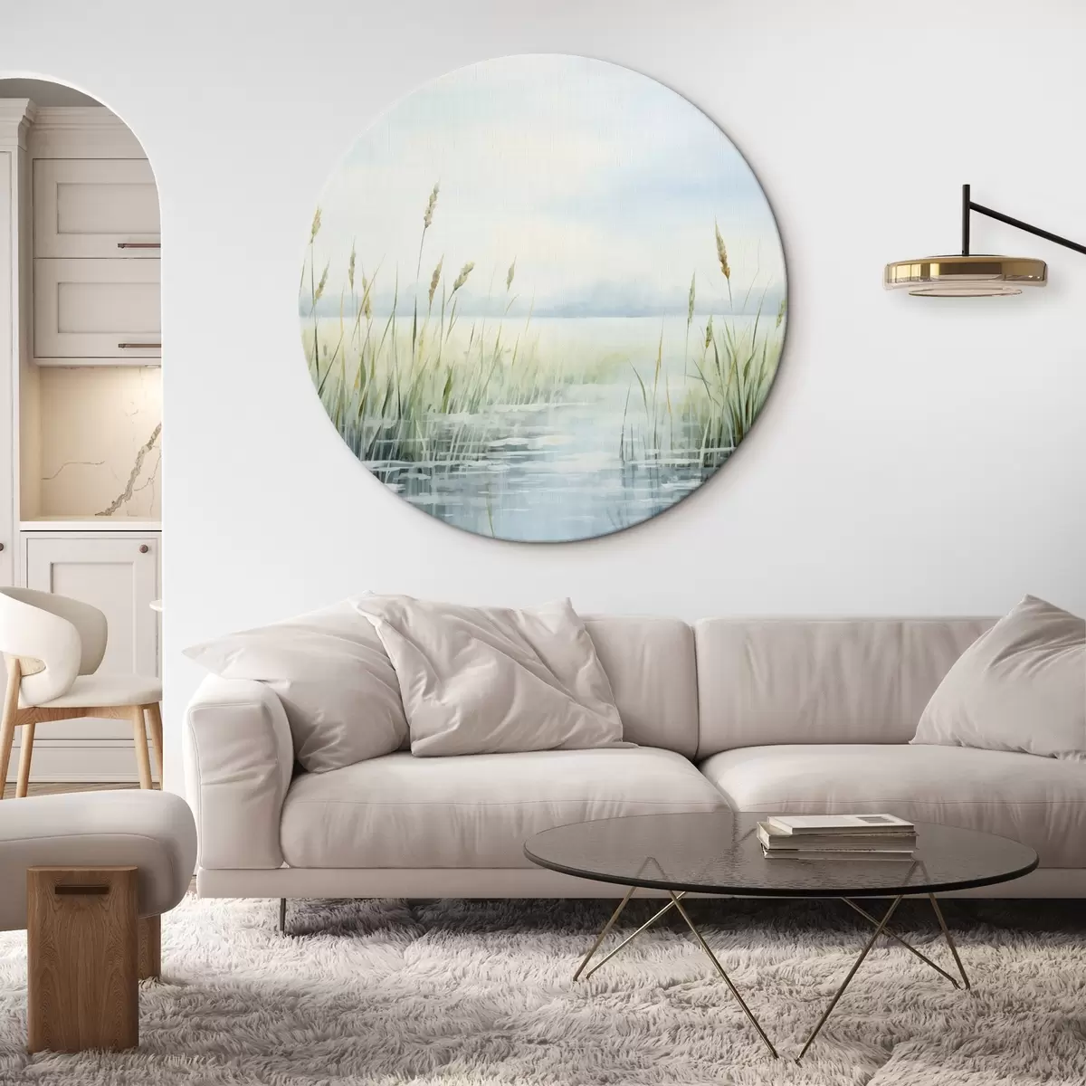 Кругла картина Акварельний живопис, що імітує високу траву, яка росте біля води, похмуре небо та розмитий фон Nr r44860