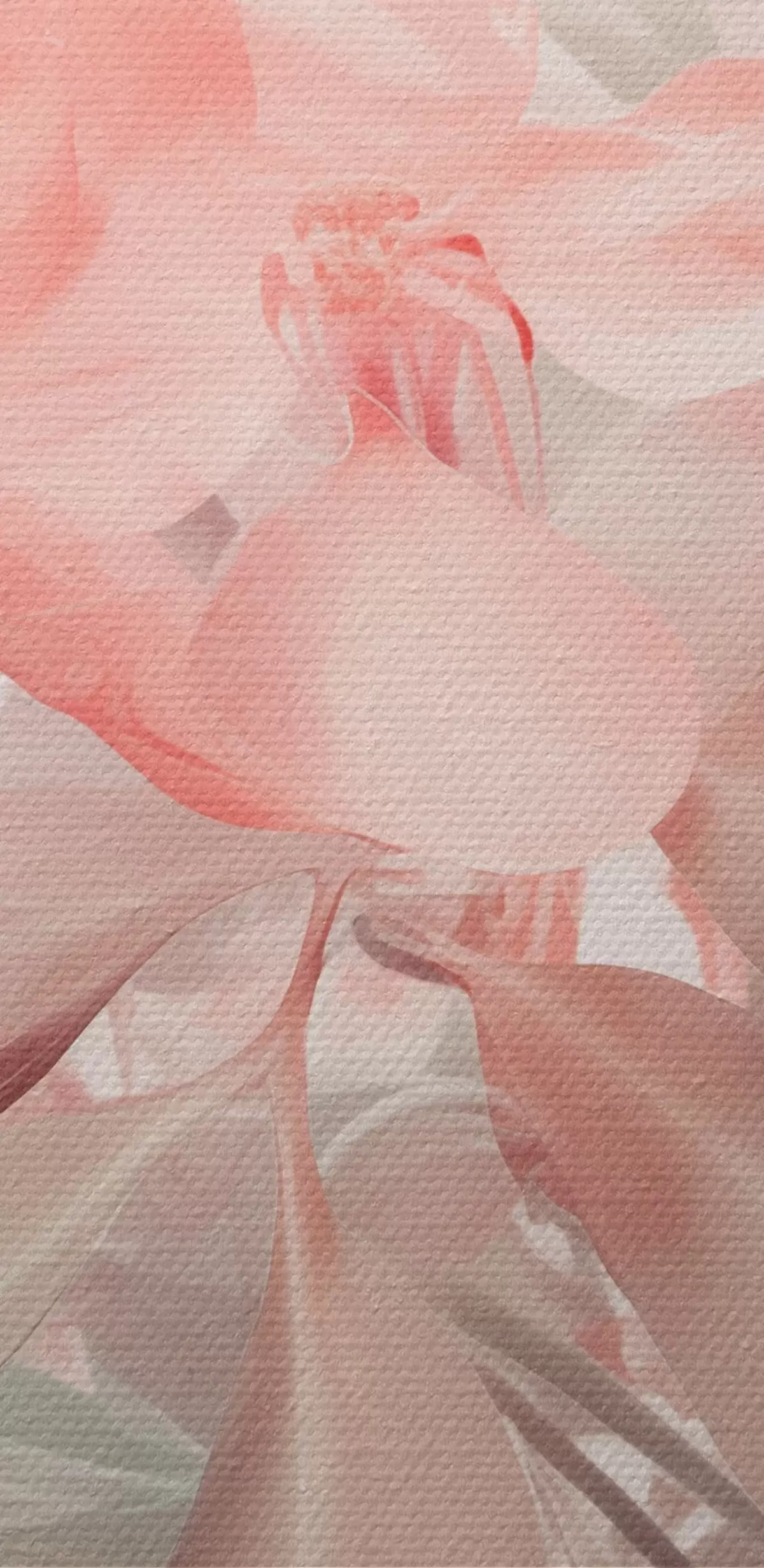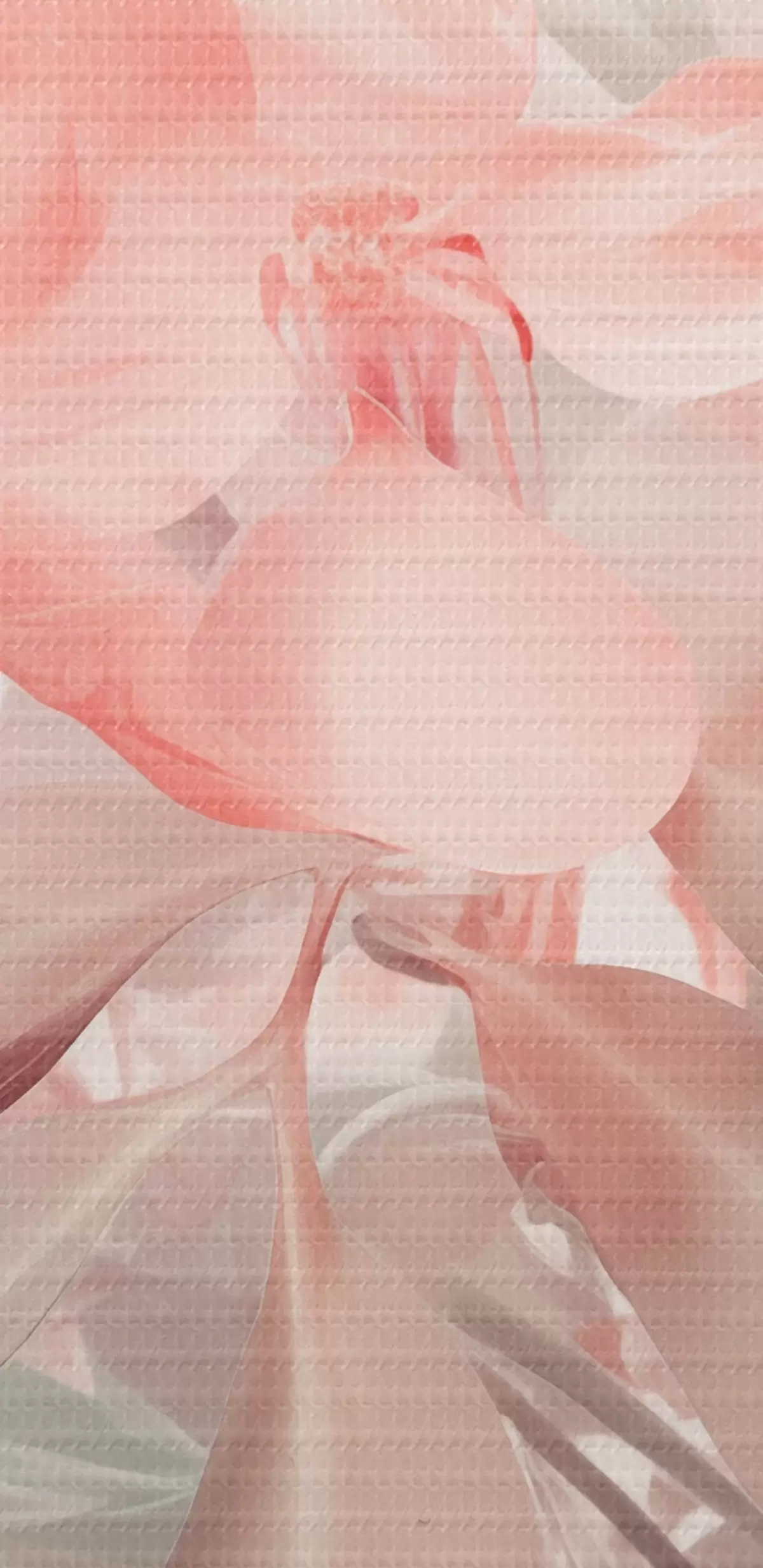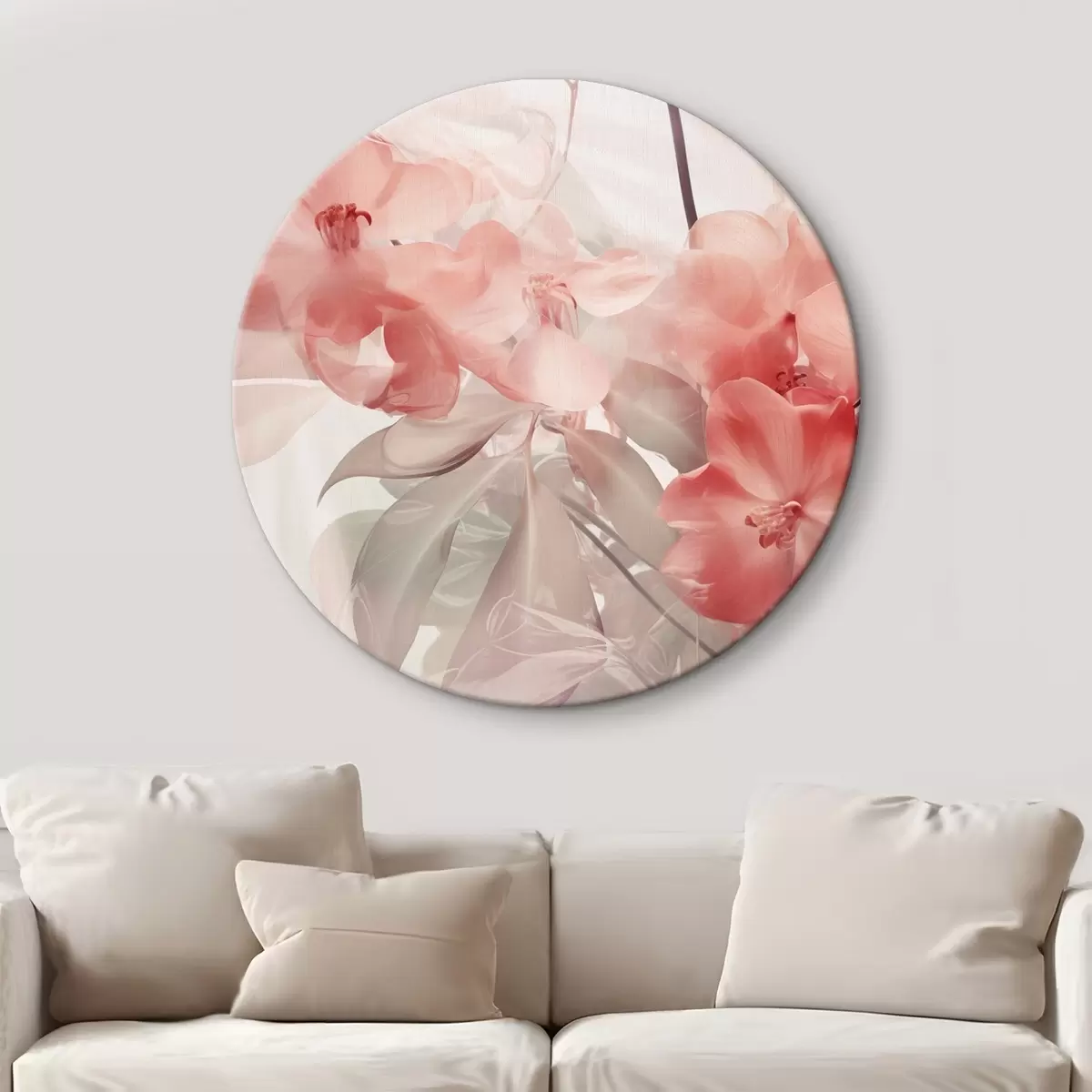 Кругла картина Яскраві рожеві тропічні квіти з м'яким, приглушеним зеленим листям, що створюють мрійливу ніжну текстуру r44861