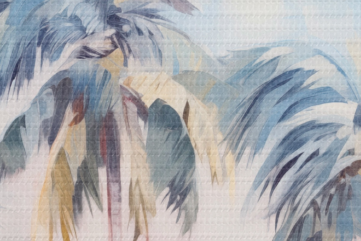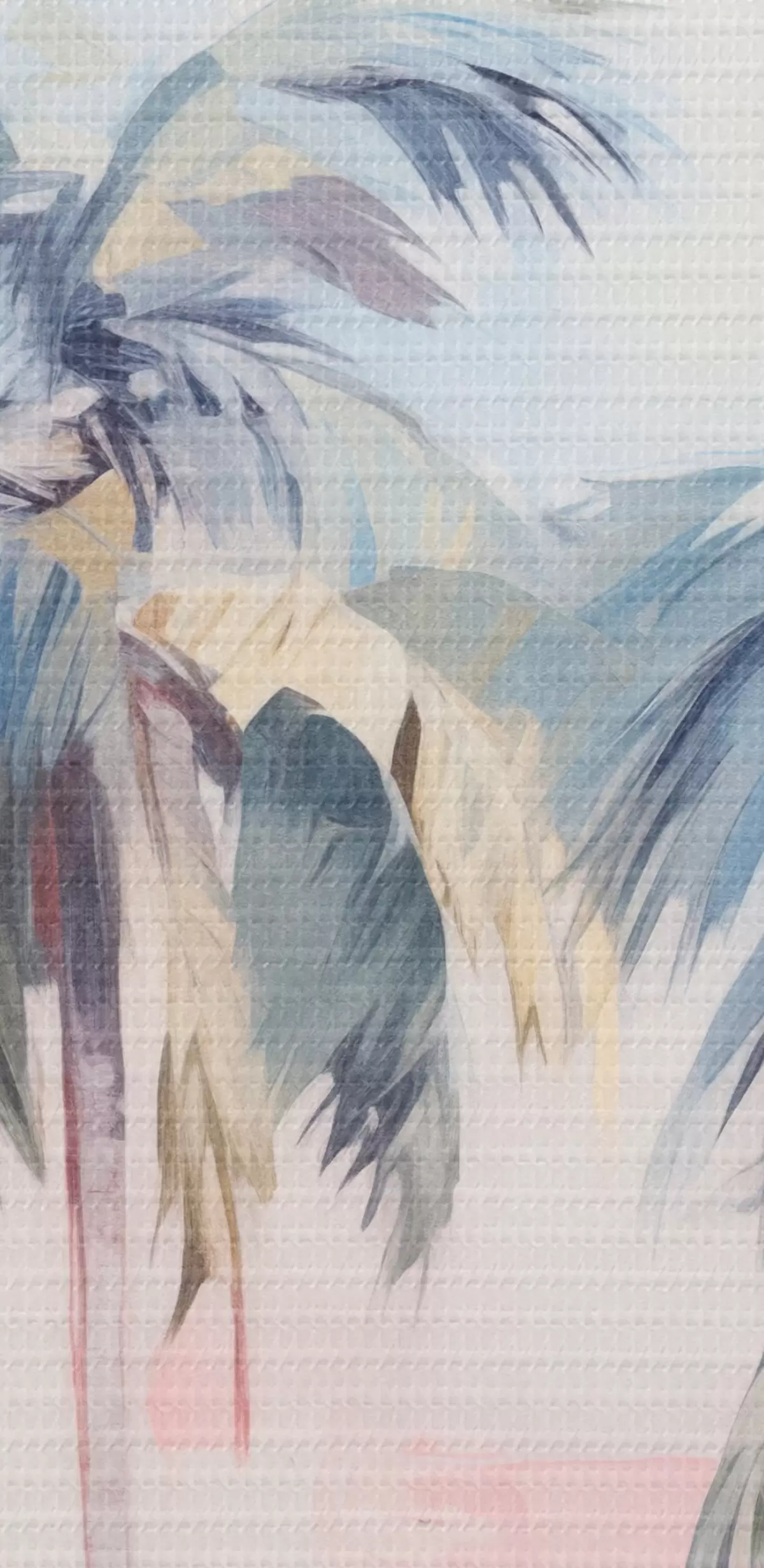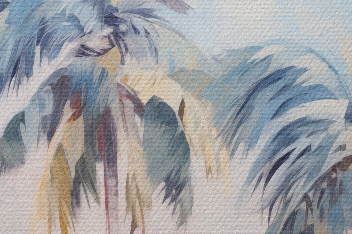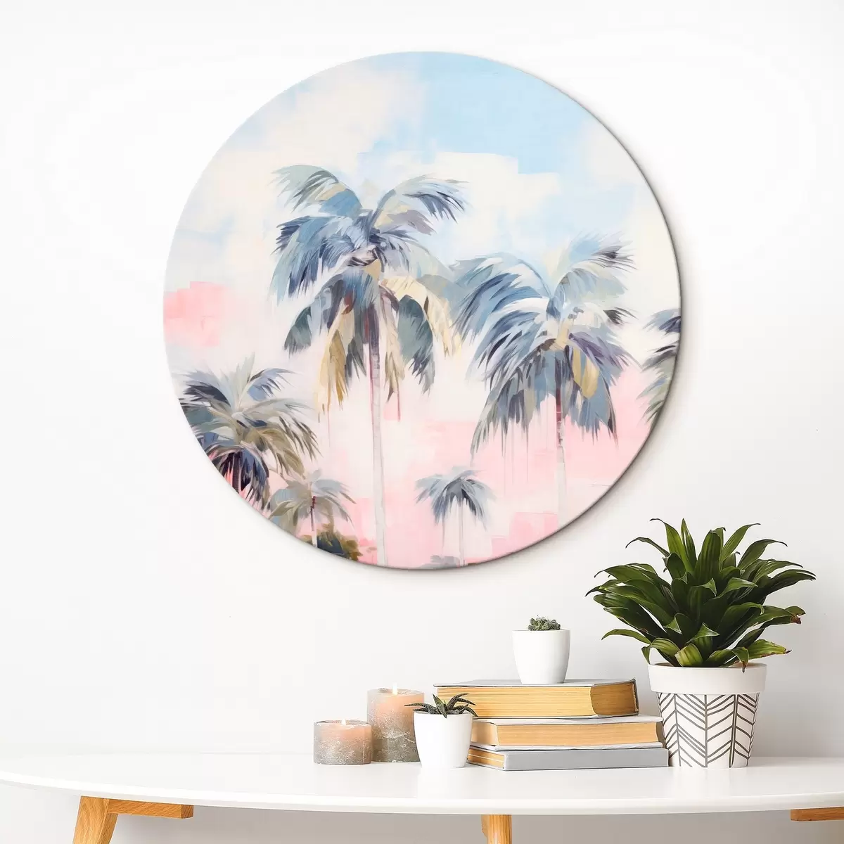 Кругла картина Пальми з пастельними кольорами листя та коричневими стовбурами, рожево-блакитне небо, тропічне середовище Nr r44866