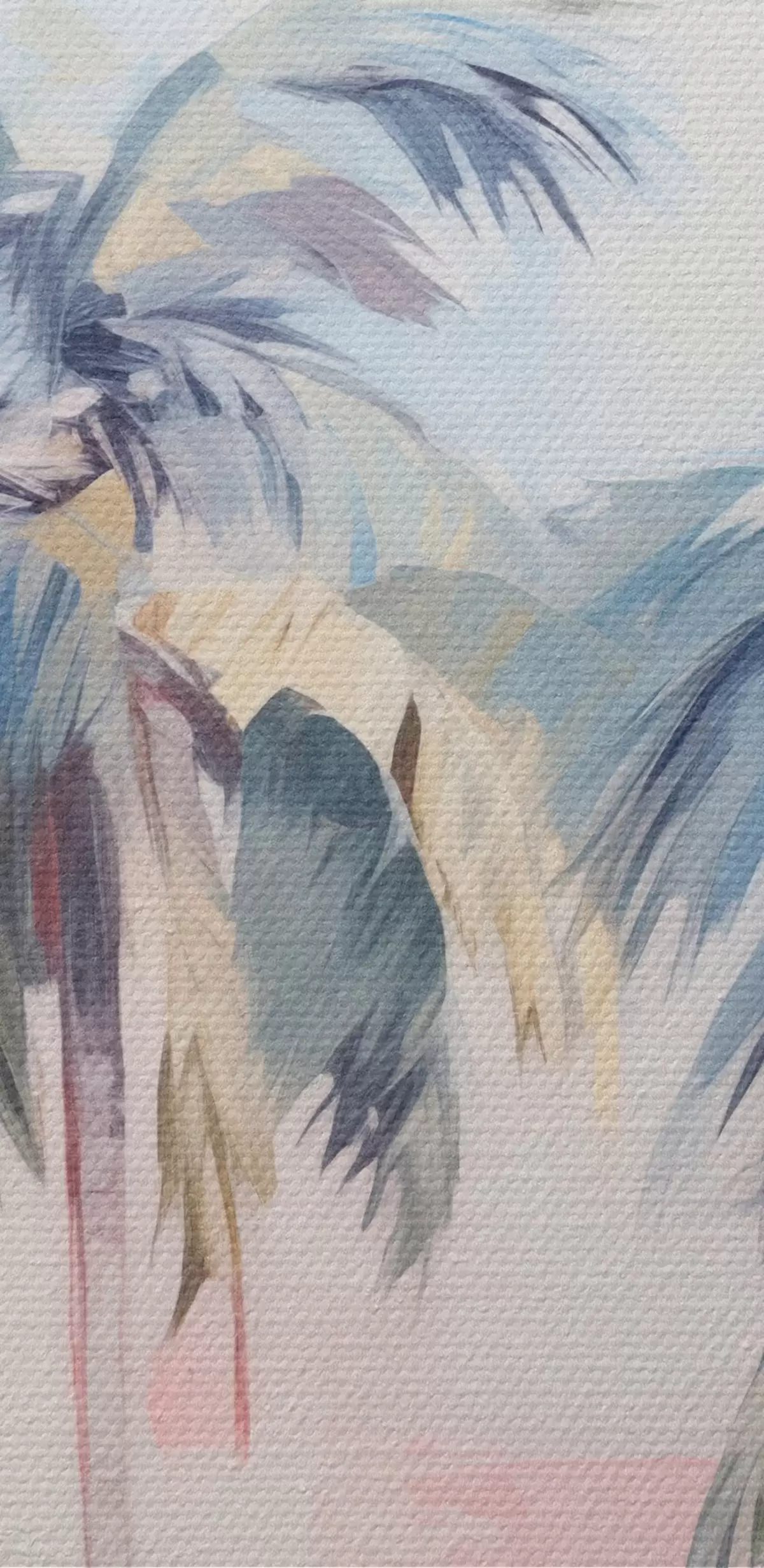 Кругла картина Пальми з пастельними кольорами листя та коричневими стовбурами, рожево-блакитне небо, тропічне середовище r44866