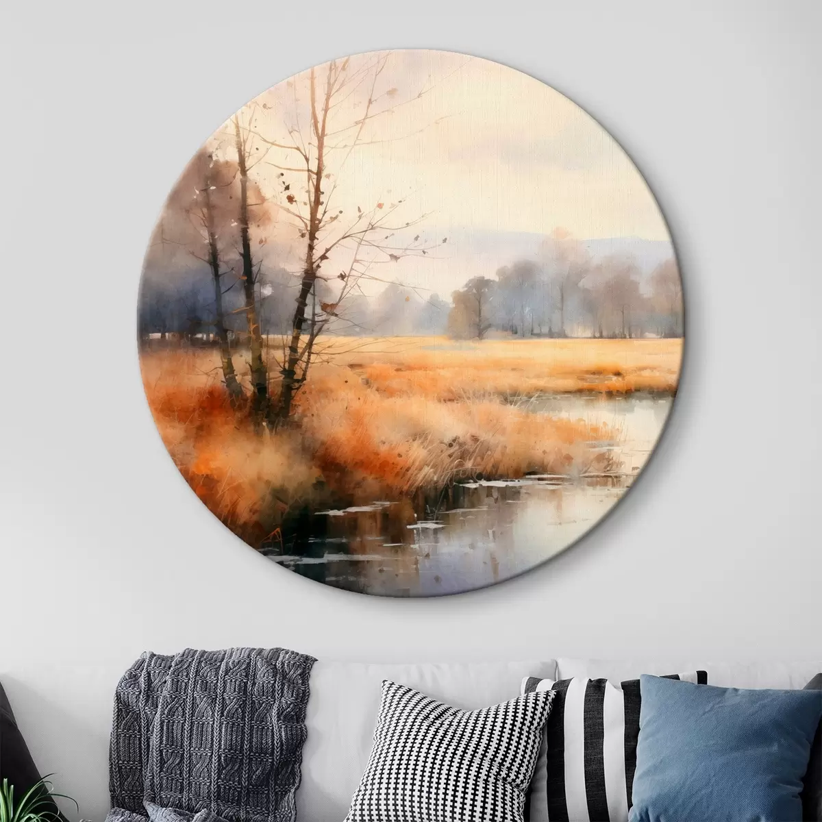 Кругла картина Спокійний фактурний пейзажний живопис, що імітує очерет і голі дерева, спокійну воду під небом Nr r44867