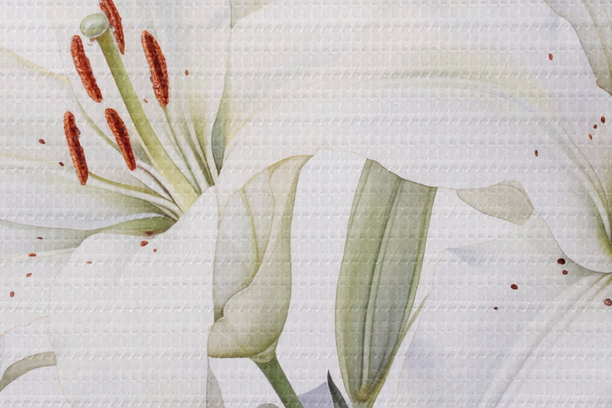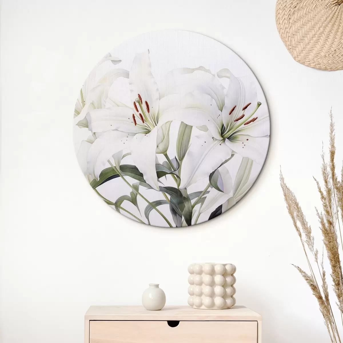 Кругла картина Букет білих лілій із зеленим листям, ніжними пелюстками та м'яким білим фоном Nr r44868