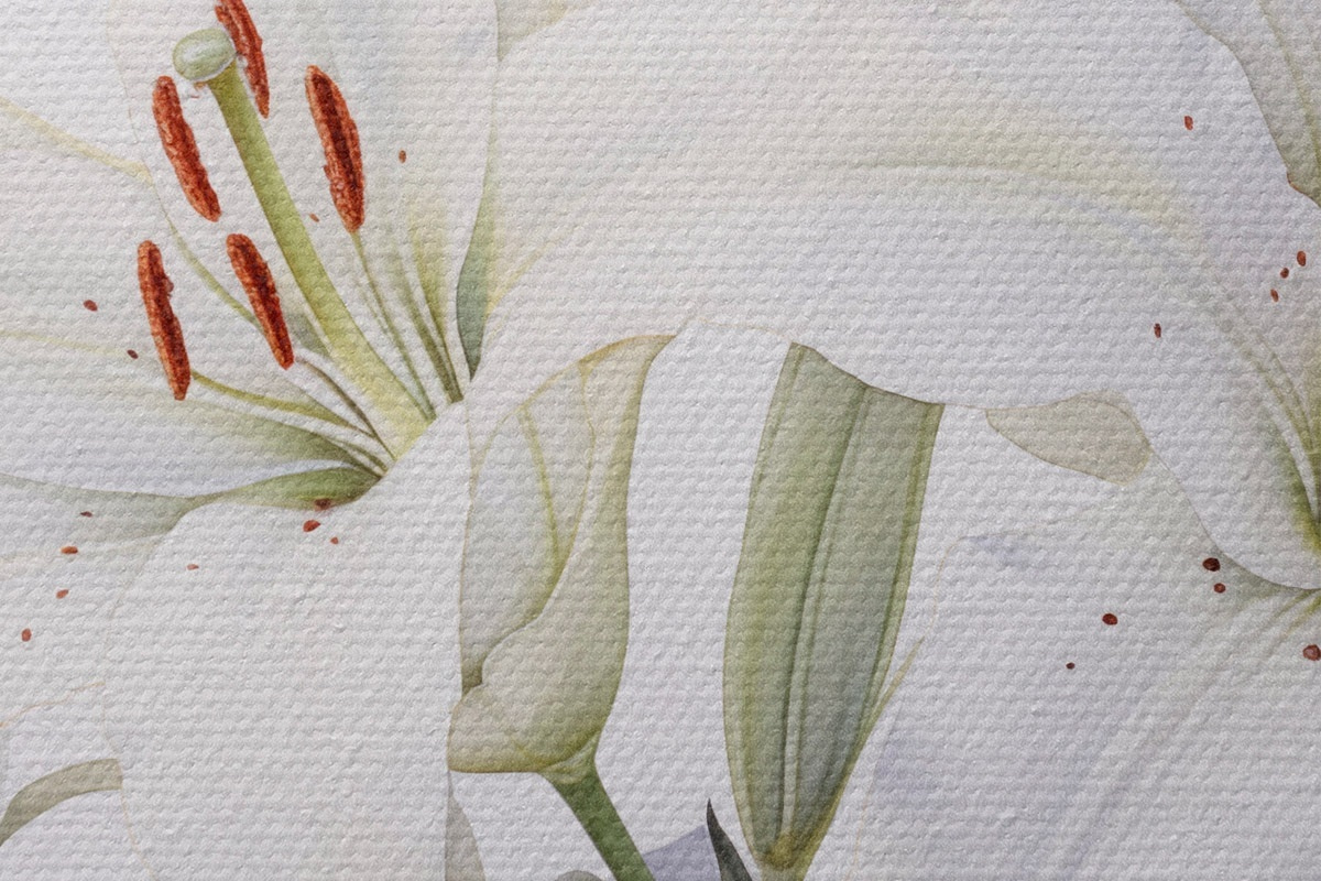 Кругла картина Букет білих лілій із зеленим листям, ніжними пелюстками та м'яким білим фоном r44868