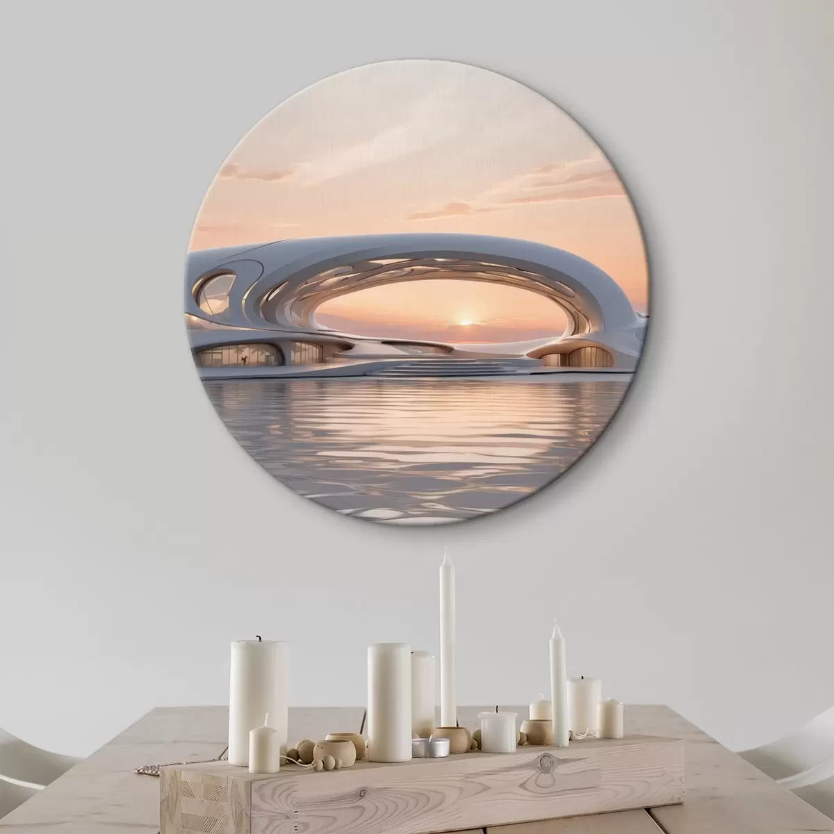 Кругла картина Футуристична будівля на воді на тлі рожевого заходу сонця Nr r44884
