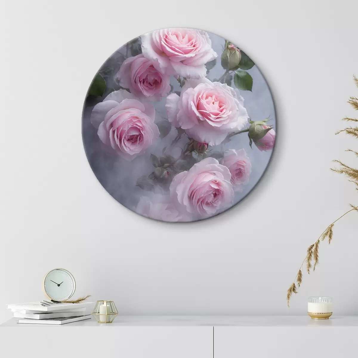 Кругла картина Ніжно-рожеві троянди в тумані з зеленим листям Nr r44892