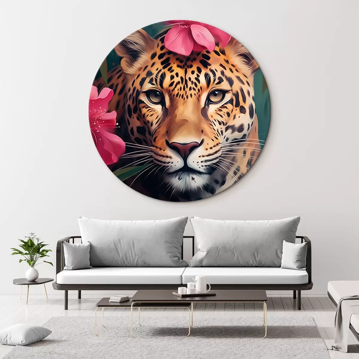 Кругла картина Леопард серед тропічних квітів Nr r44918