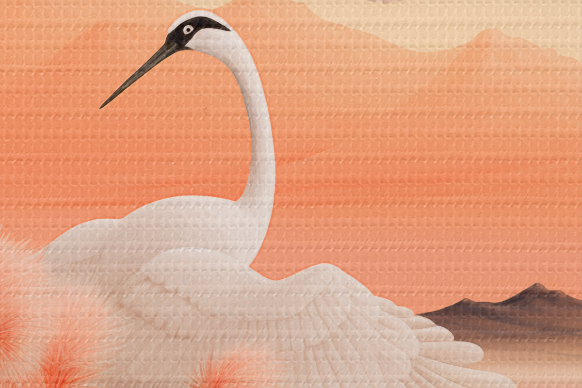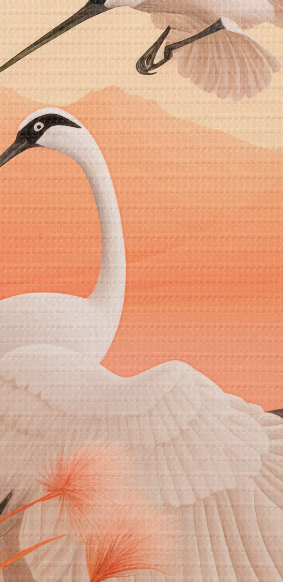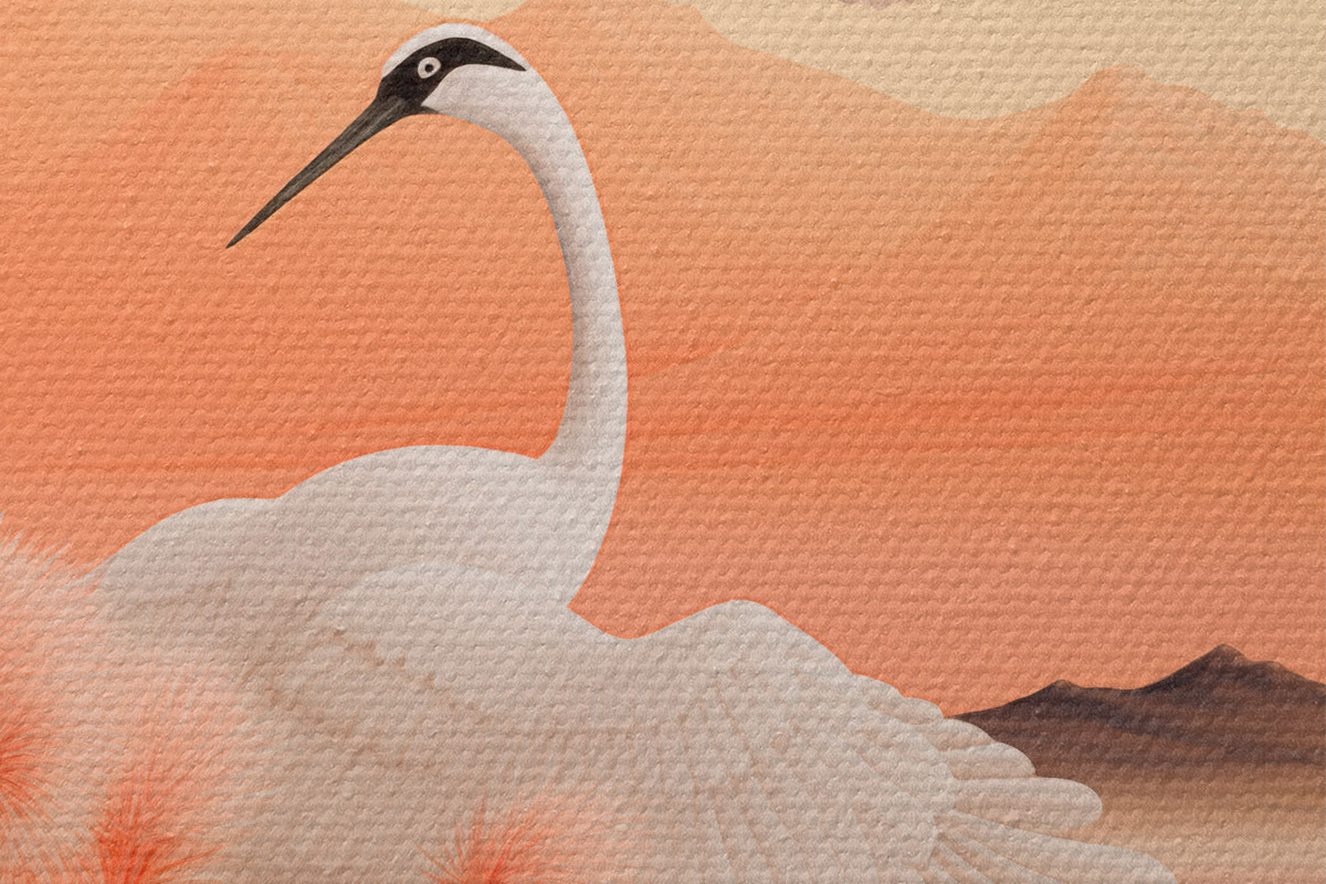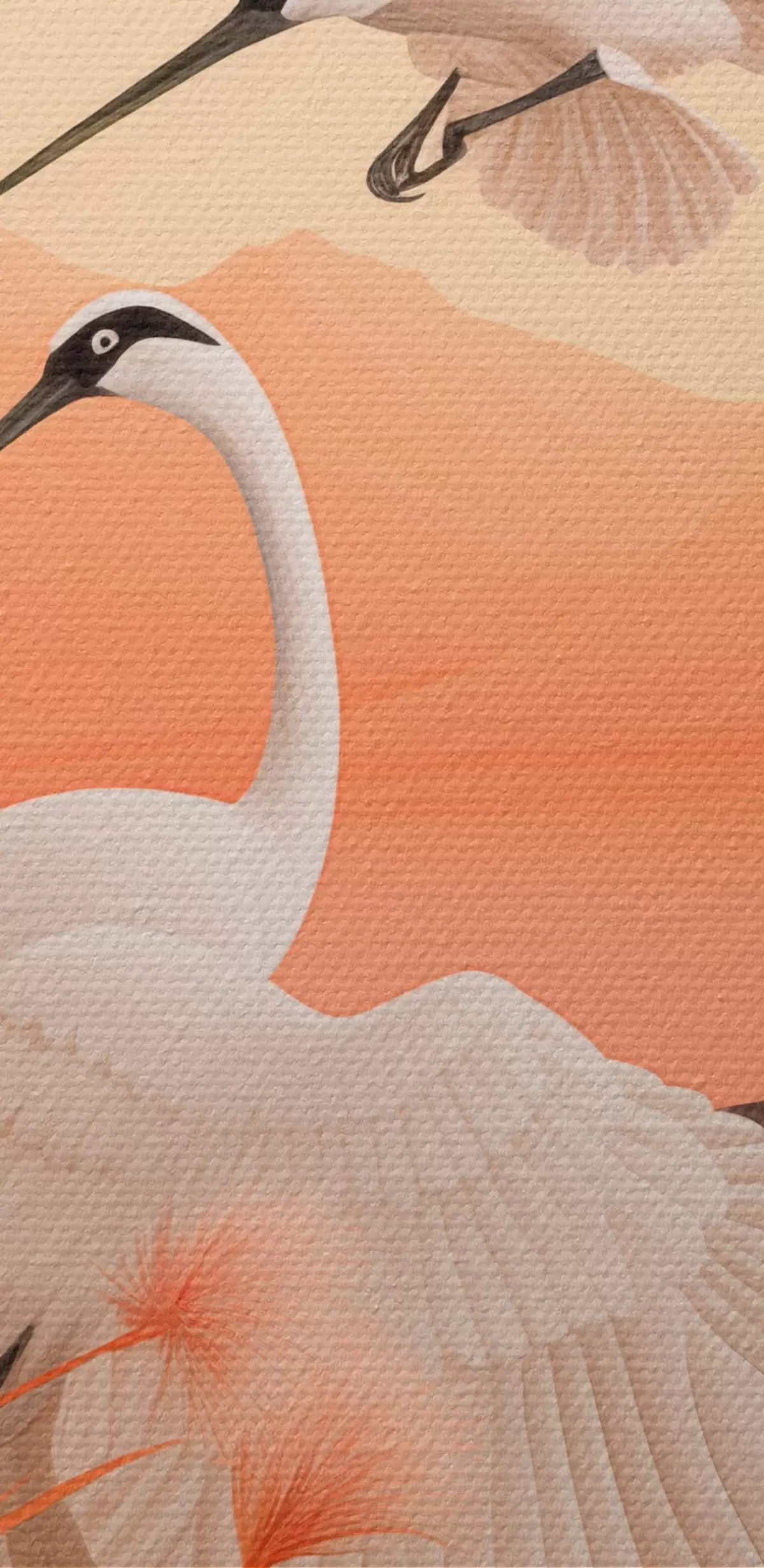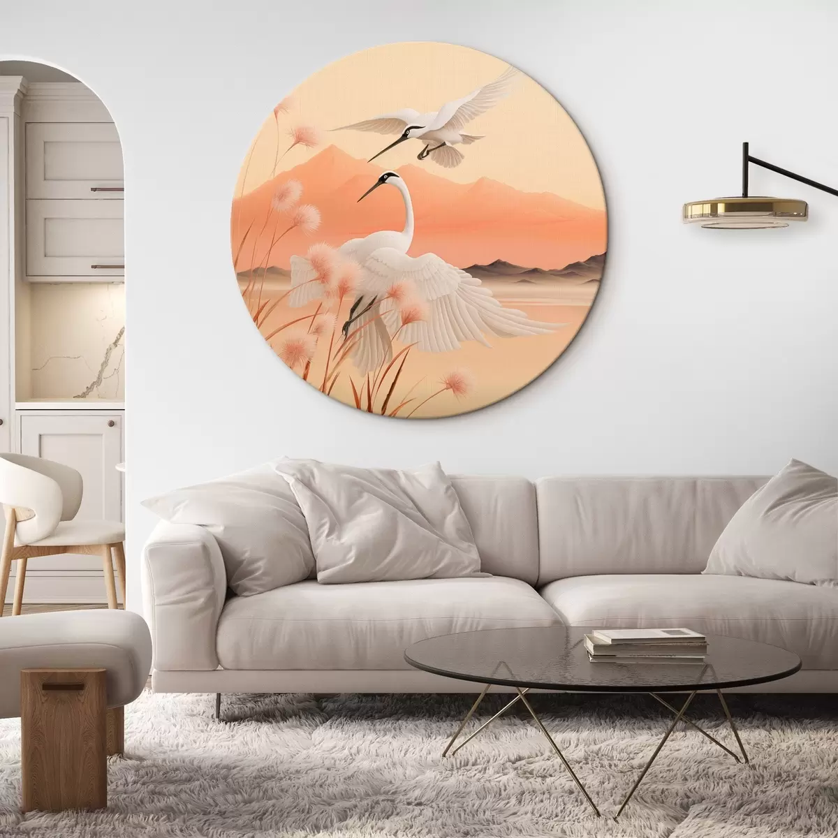 Кругла картина Білі журавлі з рожевим очеретом на передньому плані, гори та озеро на задньому плані, м'яке помаранчеве світло Nr r44925