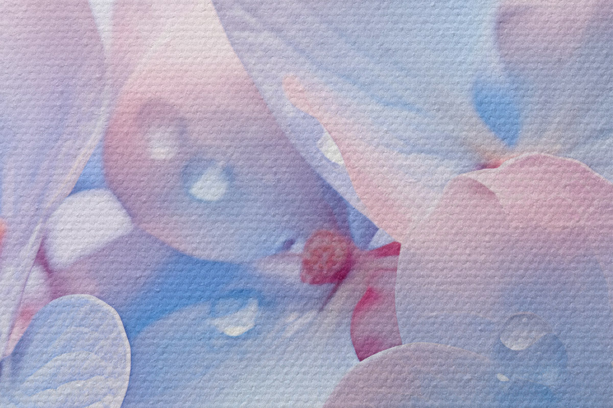 Кругла картина Квіти гортензії з крапельками води на ніжних пелюстках, м'які пастельні кольори, світло-блакитні та рожеві відтінки r44929