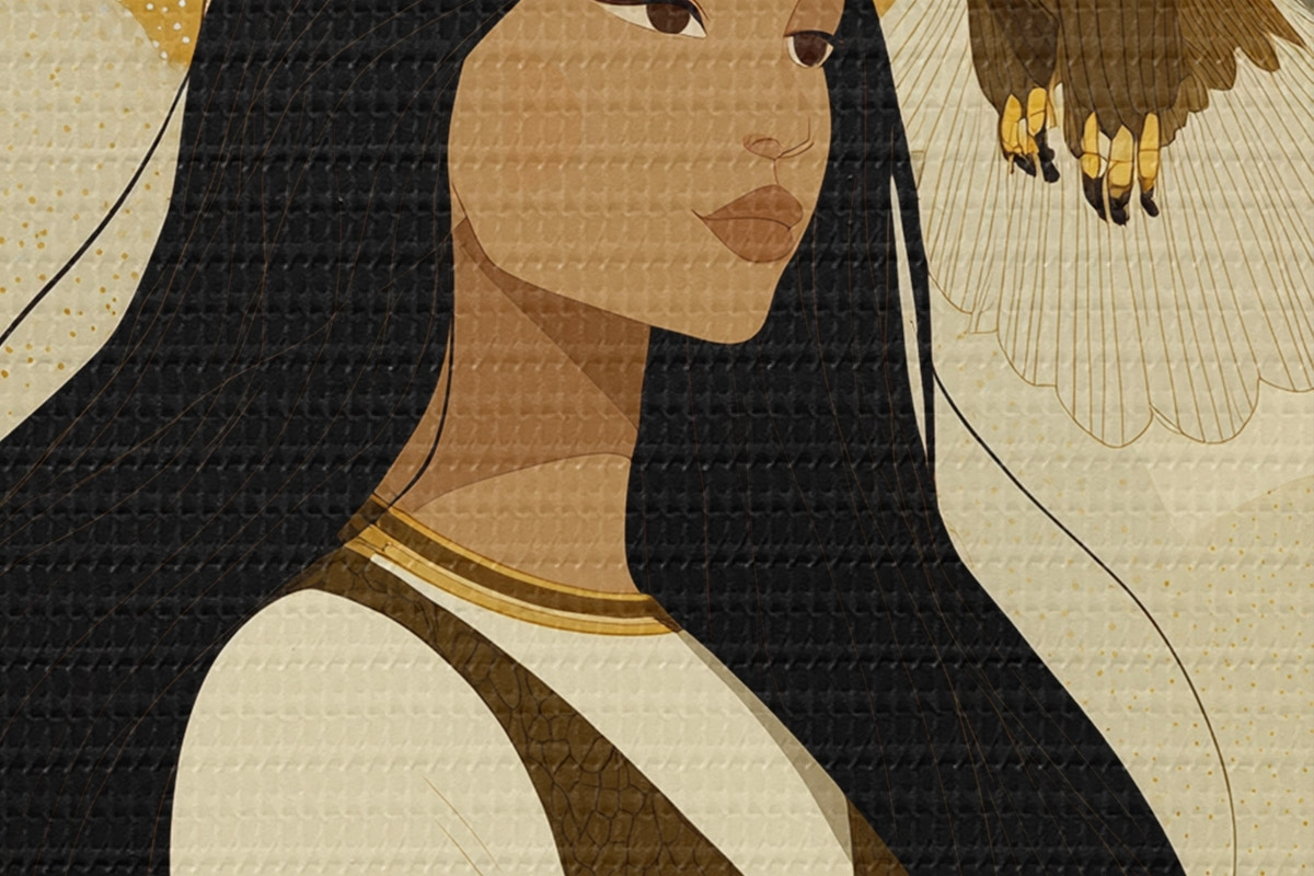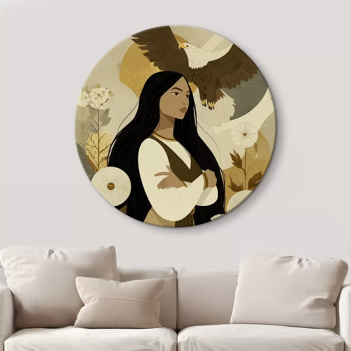 Кругла картина Жінка з орлом, що летить, в племінному стилі, бежеві кольори r44977