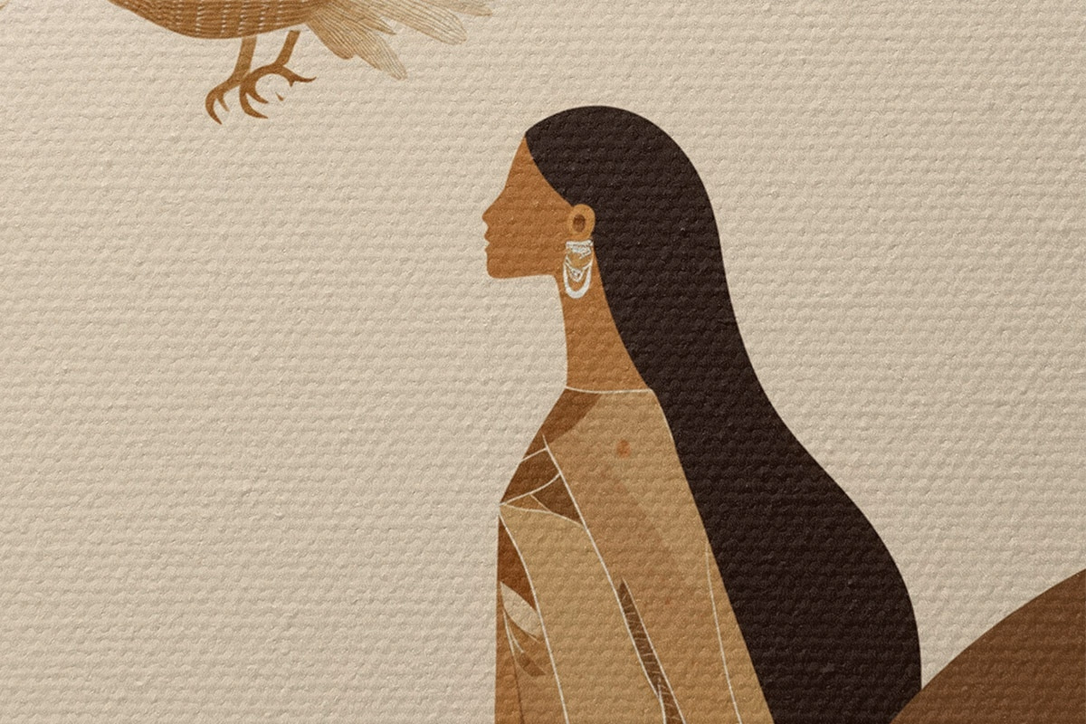 Кругла картина Абстракція з жінкою та орлом у небі, бежеві кольори r44978