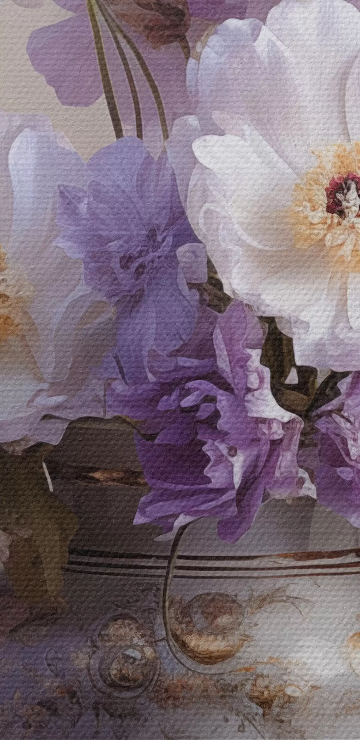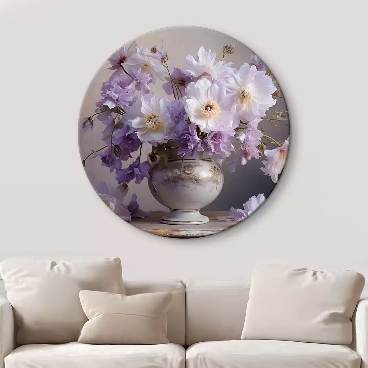 Кругла картина Квітковий натюрморт: білі та фіолетові квіти в художньому стилі r45058