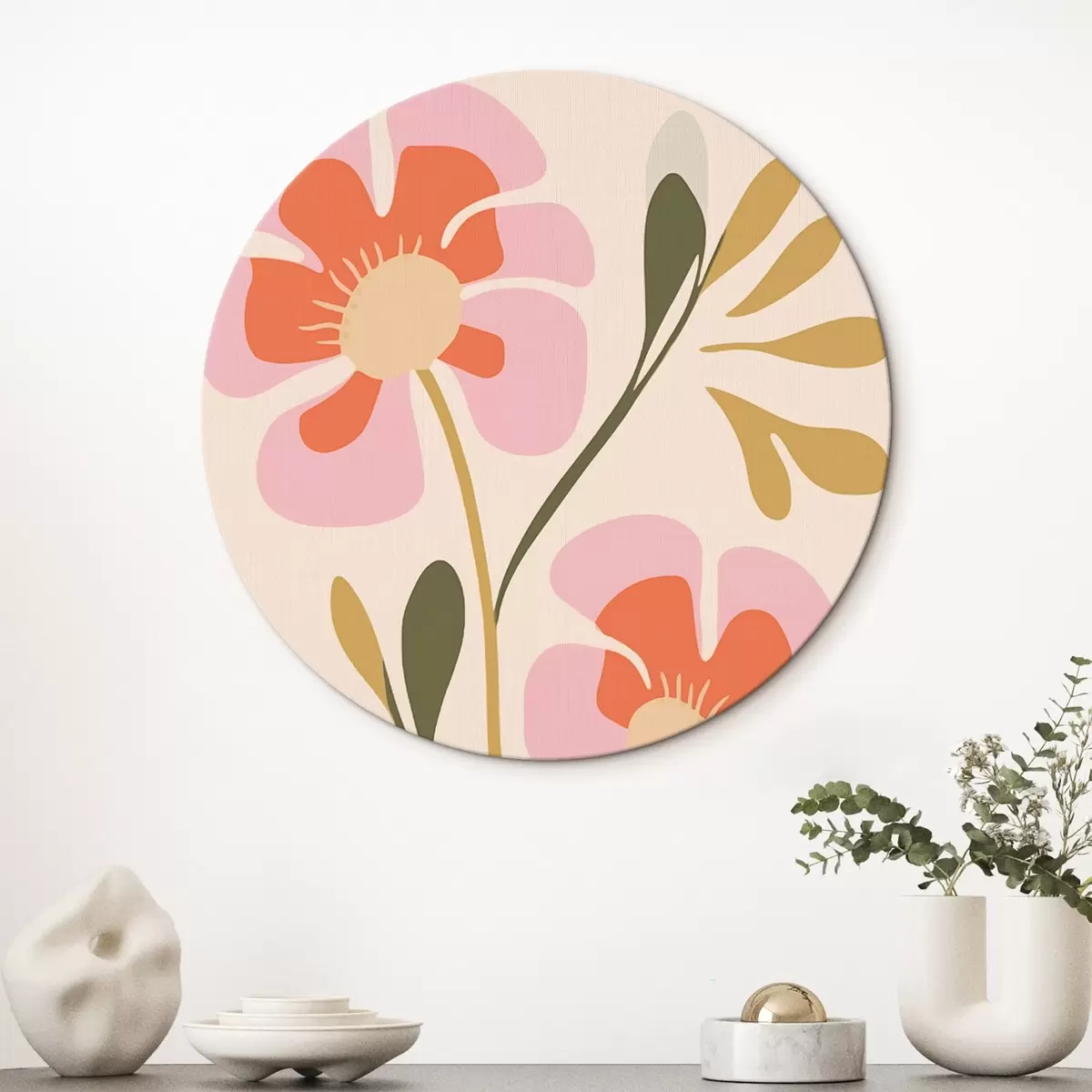 Кругла картина Стилізовані рожеві та помаранчеві квіти з зеленим листям r45140
