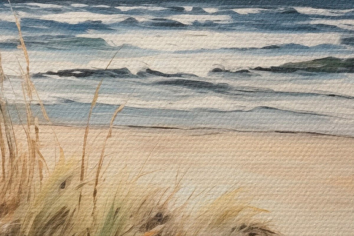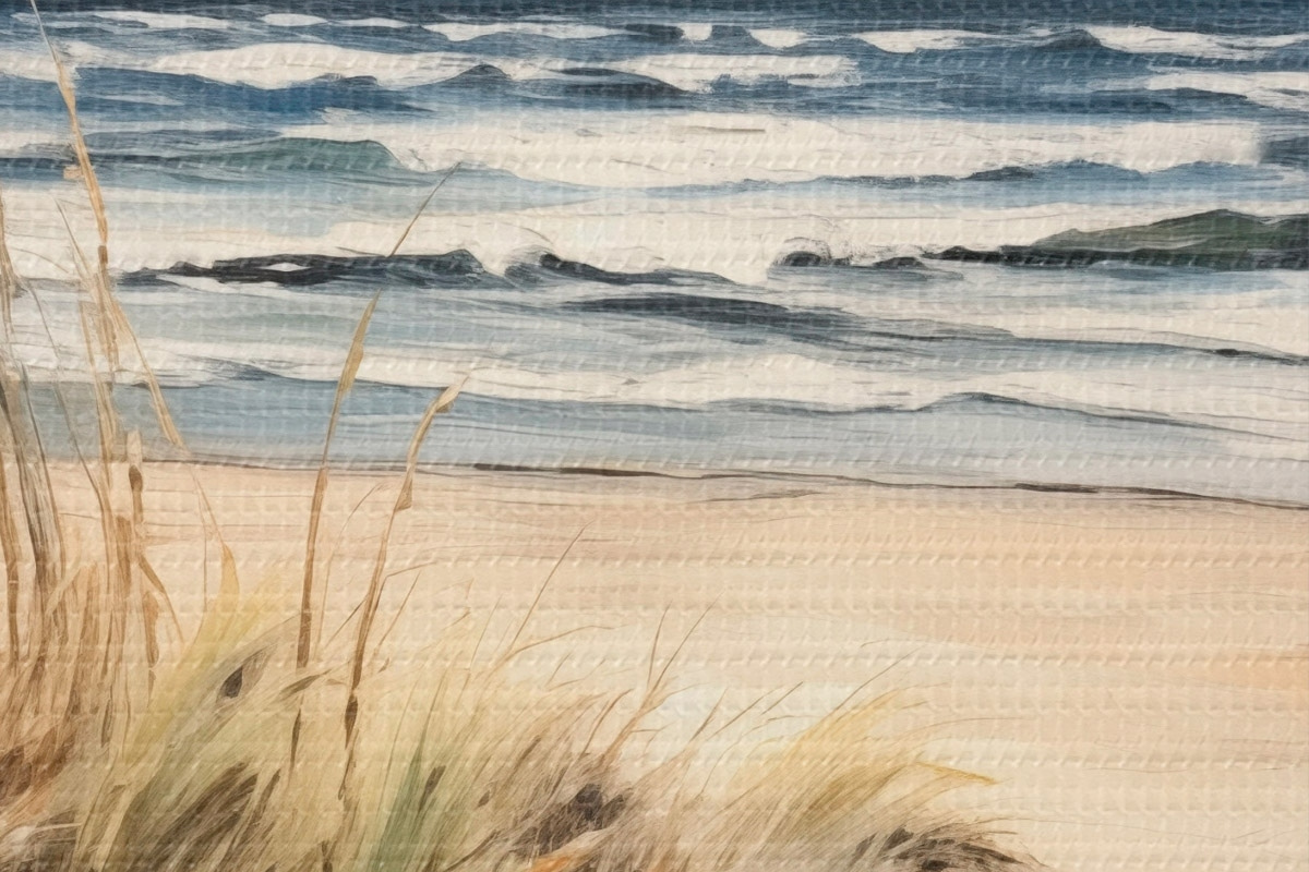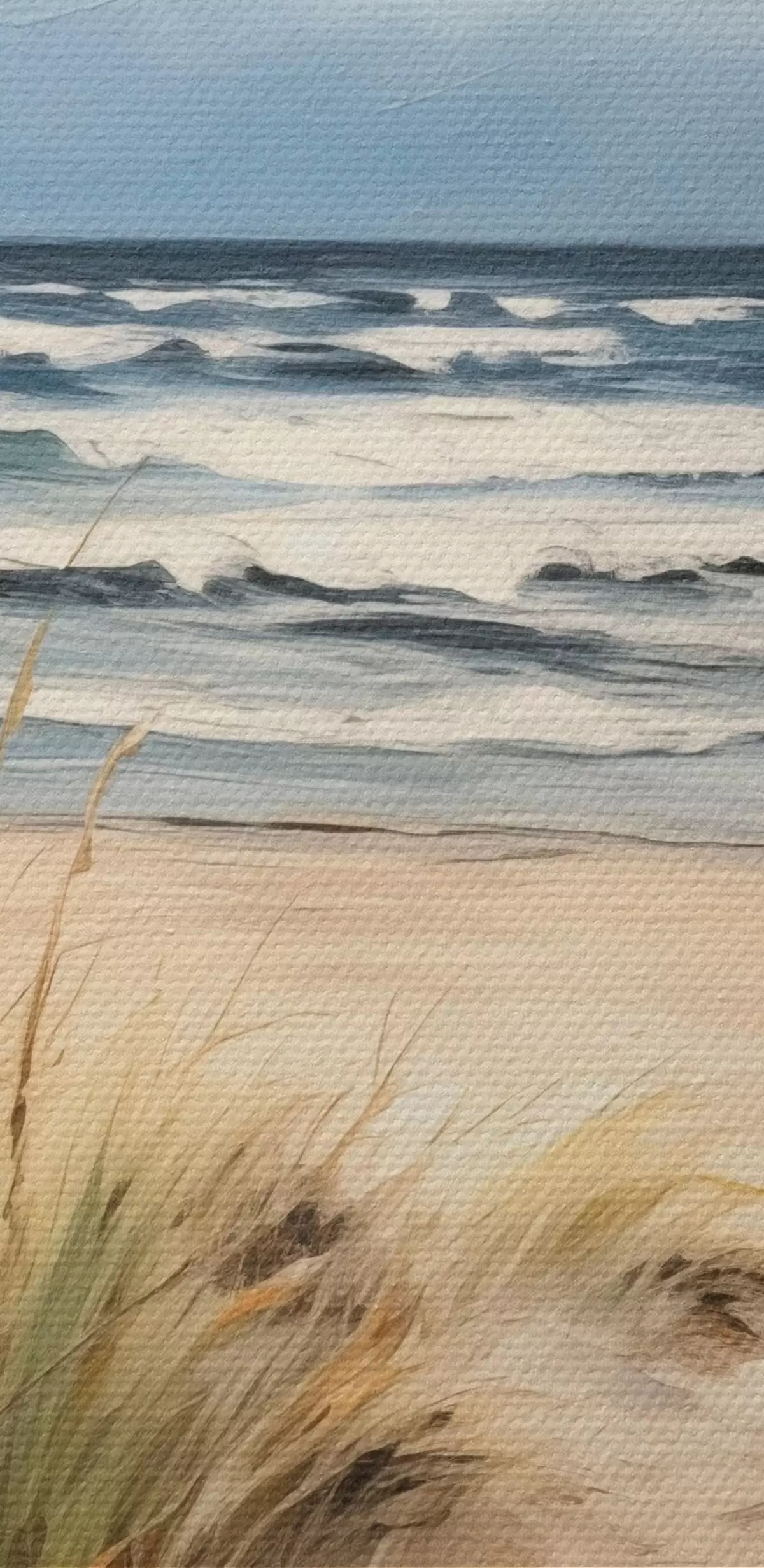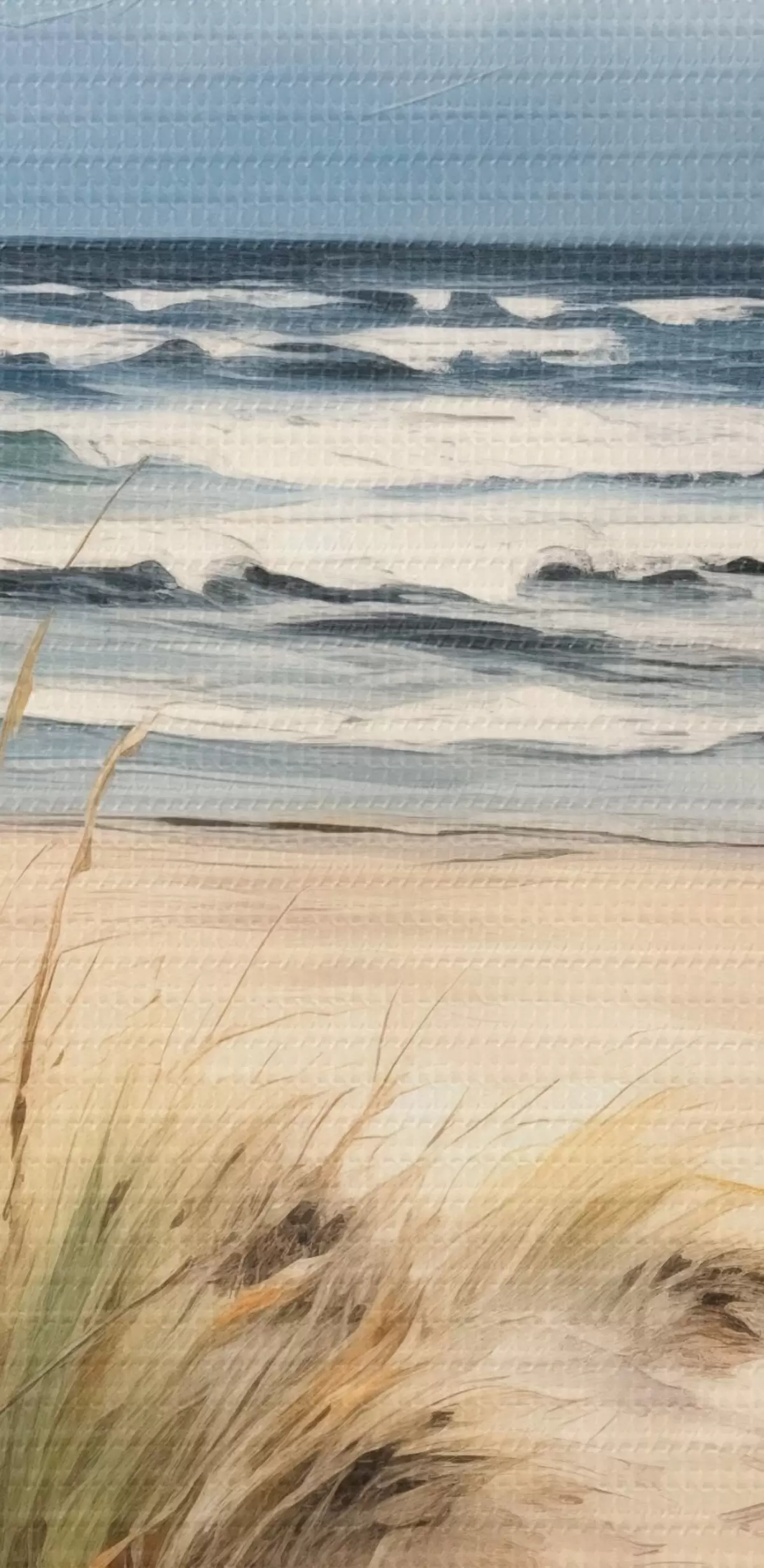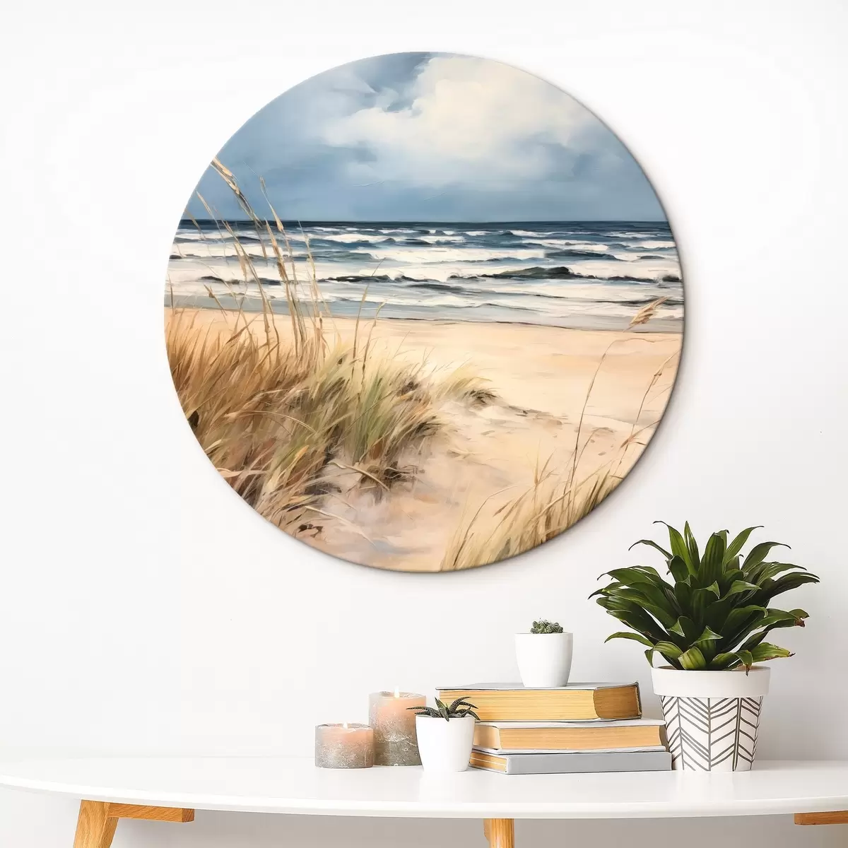 Кругла картина Піщаний пляж з високою травою на передньому плані, океан з хвилями і хмарне небо на задньому плані Nr r45173